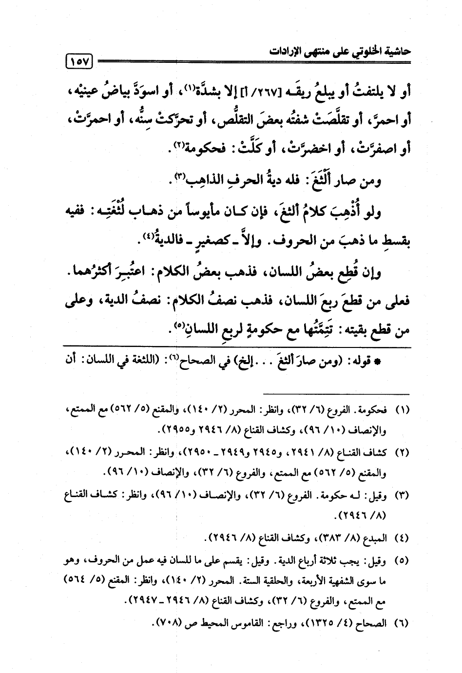 (¬5) وقيل: يجب ثلاثة أرباع الدية. وقيل: يقسم على ما للسان فيه عمل من الحروف، وهو ما سوى الشفهية الأربعة، والحلقية الستة. المحرر (2/ 140)، وانظر: المقتع (5/ 564) مع الممتع، والفروع (6/ 32)، وكشاف القناع (8/ 2946 - 2947).
