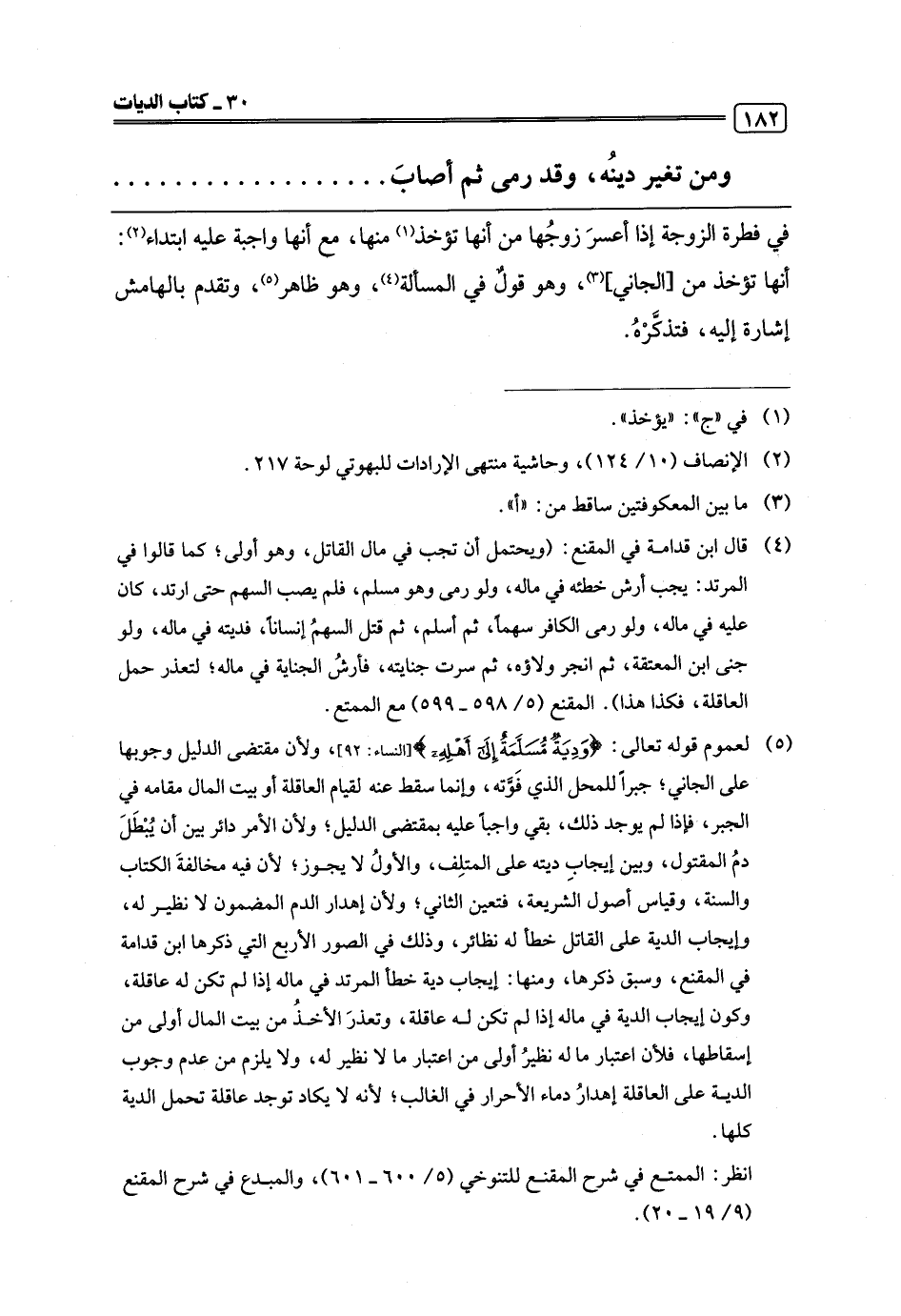 (¬4) قال ابن قدامة في المقنع: (ويحتمل أن تجب في مال القاتل، وهو أولى؛ كما قالوا في المرتد: يجب أرش خطئه في ماله، ولو رمى وهو مسلم، فلم يصب السهم حتى ارتد، كان عليه في ماله، ولو رمى الكافر سهمًا، ثم أسلم، ثم قتل السهمُ إنسانًا، فديته في ماله، ولو جنى ابن المعتقة، ثم انجر ولاؤه، ثم سرت جنايته، فأرشُ الجناية في ماله؛ لتعذر حمل العاقلة، فكذا هذا). المقنع (5/ 598 - 599) مع الممتع.