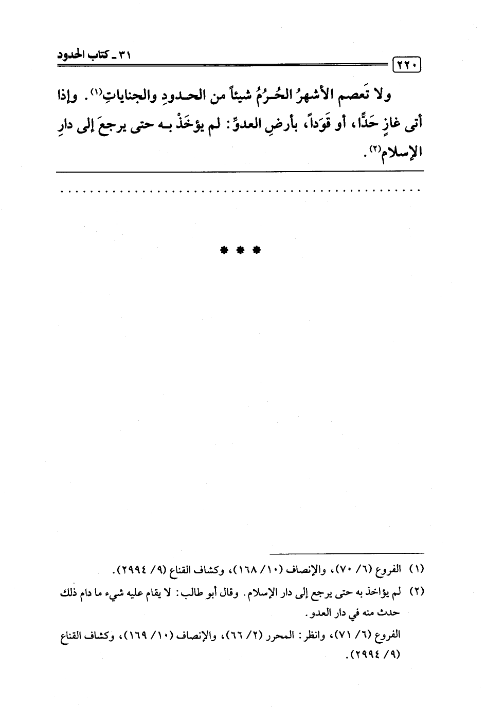 ولا تَعصم الأشهرُ الحُرُمُ شيئًا من الحدودِ والجناياتِ (¬1). وإذا أتى غازٍ حَدًّا، أو قَوَدًا، بأرضِ العدوِّ: لم يؤخَذْ به حتى يرجعَ إلى دارِ الإسلام (¬2).