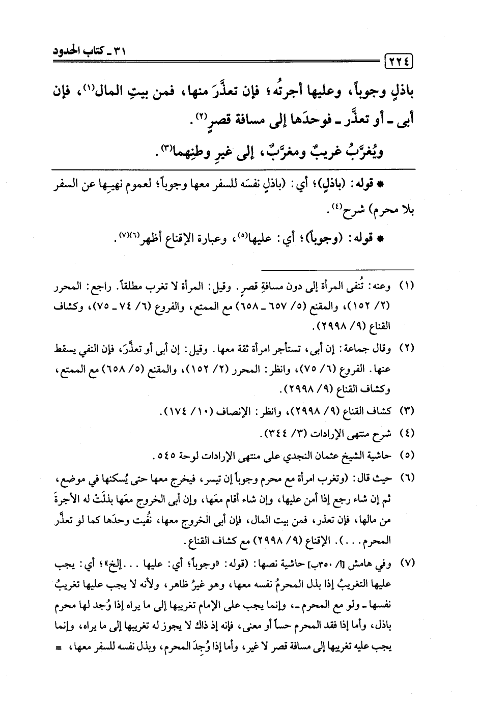 (¬7) وفي هامش [أ/ 350 ب] حاشية نصها: (قوله: "وجوبًا؛ أي: عليها. . . إلخ"؛ أي: يجب عليها التغريبُ إذا بذل المحرمُ نفسه معها، وهو غيرُ ظاهر، ولأنه لا يجب عليها تغريبُ نفسها -ولو مع المحرم-، وإنما يجب على الإمام تغريبها إلى ما يراه إذا وُجد لها محرم باذل، وأما إذا فقد المحرم حسًا أو معنى، فإنه إذ ذاك لا يجوز له تغريبها إلى ما يراه، وإنما يجب عليه تغريبها إلى مسافة قصر لا غير، وأما إذا وُجِدَ المحرم، وبذل نفسه للسفر معها، =