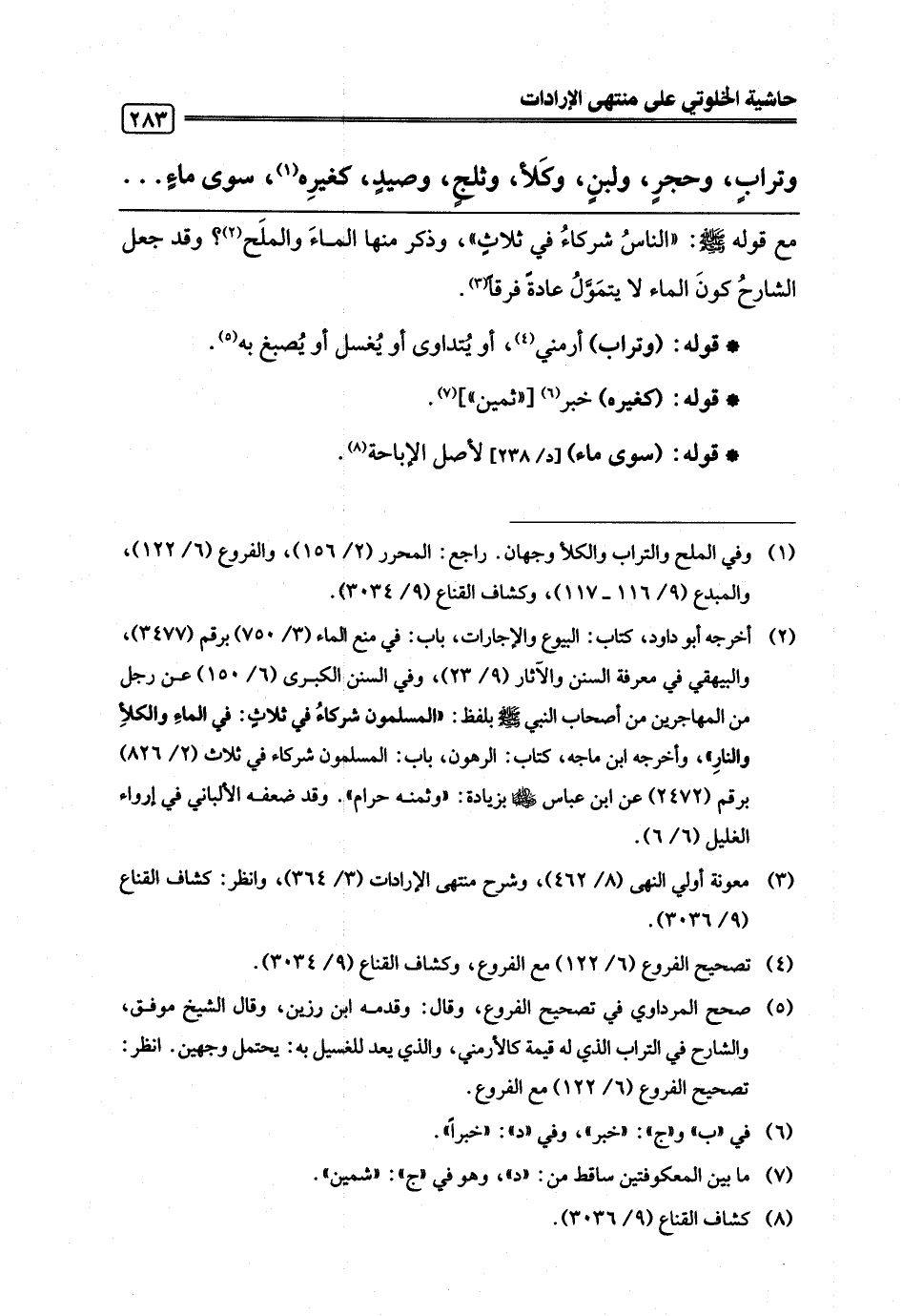 (¬1) وفي الملح والتراب والكلأ وجهان. راجع: المحرر (2/ 156)، والفروع (6/ 122)، والمبدع (9/ 116 - 117)، وكشاف القناع (9/ 3034).