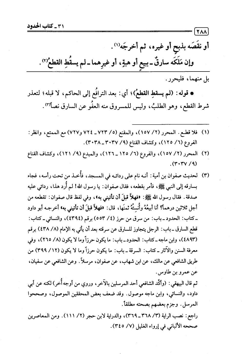 (¬3) لحديث صفوان بن أمية: أنه نام على ردائه في المسجد، فأُخذ من تحت رأسه، فجاء بسارقه إلى النبي -صلى اللَّه عليه وسلم-، فأمر بقطعه، فقال صفوان: يا رسول اللَّه! لم أُرد هذا، ردائي عليه صدقة. فقال رسول اللَّه -صلى اللَّه عليه وسلم-: "فهلَّا قبلَ أن تأتيني به"، وفي لفظ قال صفوان: تقطعه من أجل ثلاثين درهمًا؟ أنا أبيعُهُ وأُنسِئُهُ ثمنَها، قال: "فهلَّا قبلَ أن تأتيني به" أخرجه أبو داود -كتاب: الحدود- باب: من سرق من حرز (4/ 553) برقم (4394)، والنسائي -كتاب: قطع السارق- باب: الرجل يتجاوز للسارق عن سرقته بعد أن يأتي به الإمام (8/ 438) برقم (4893)، وابن ماجه -كتاب: الحدود- باب: ما يكون حرزًا وما لا يكون (8/ 265)، وفي معرفة السنن والآثار -كتاب: السرقة- باب: ما يكون حرزًا وما لا يكون (12/ 399) من طريق الشافعي عن مالك، عن ابن شهاب، عن صفوان، مرسلًا. وعن الشافعي عن سفيان، عن عمرو بن طاوس.