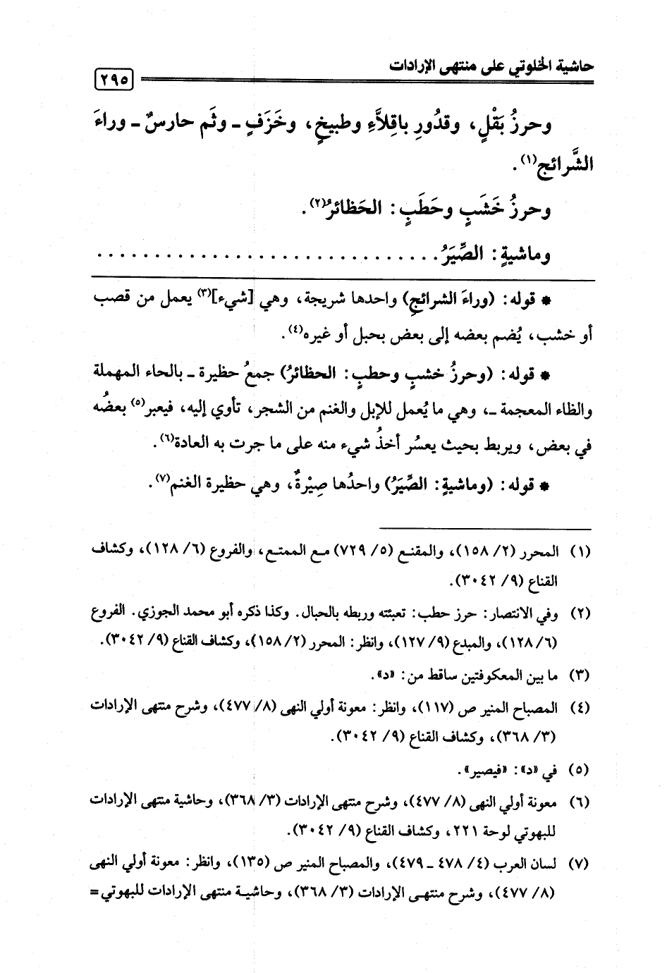 * قوله: (وحرزُ خشبٍ وحطبٍ: الحظائرُ) جمعُ حظيرة -بالحاء المهملة والظاء المعجمة-، وهي ما يُعمل للإبل والغنم من الشجر، تأوي إليه، فيعبر (¬5) بعضُه في بعض، ويربط بحيث يعسُر أخذُ شيء منه على ما جرت به العادة (¬6).