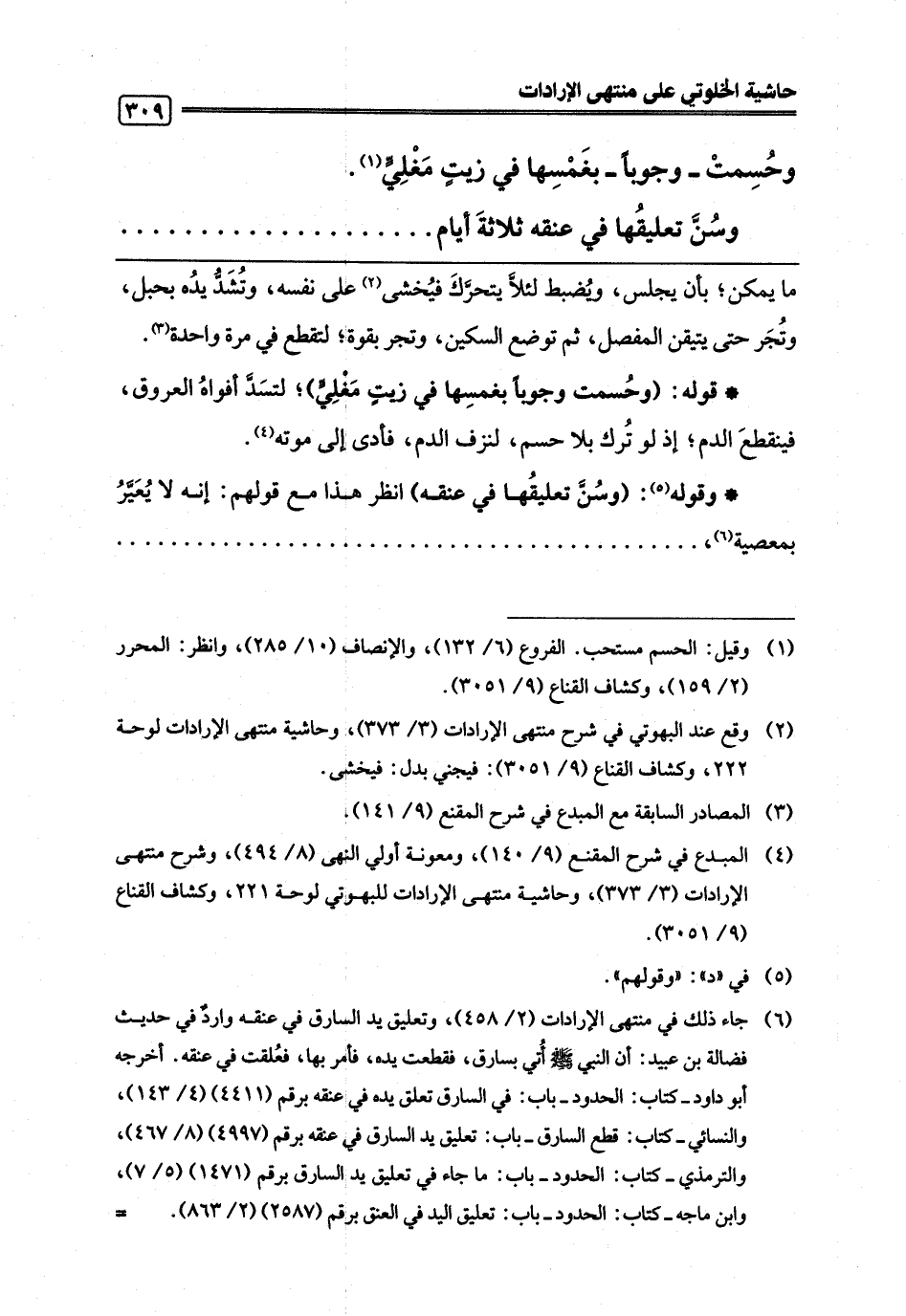 (¬6) جاء ذلك في منتهى الإرادات (2/ 458)، وتعليق يد السارق في عنقه واردٌ في حديث فضالة بن عبيد: أن النبي -صلى اللَّه عليه وسلم- أُتي بسارق، فقطعت يده، فأمر بها، فعُلقت في عنقه. أخرجه أبو داود -كتاب: الحدود- باب: في السارق تعلق يده في عنقه برقم (4411) (4/ 143)، والنسائي -كتاب: قطع السارق- باب: تعليق يد السارق في عنقه برقم (4997) (8/ 467)، والترمذي -كتاب: الحدود- باب: ما جاء في تعليق يد السارق برقم (1471) (5/ 7)، وابن ماجه -كتاب: الحدود- باب: تعليق اليد في العنق برقم (2587) (2/ 863). =