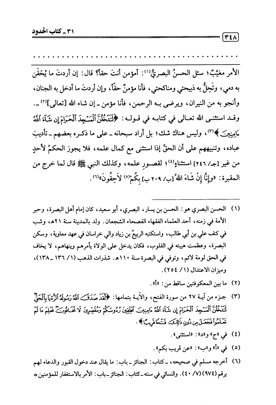 الأمر مغيَّبٌ؛ سئل الحسنُ البصريُّ (¬1): أمؤمن أنتَ حقًا؟ قال: إن أردتَ ما يُحْقَن به دمي، وتَحِلُّ به ذبيحتي ومناكحتي، فأنا مؤمن حقًّا، وإن أردتَ ما أدخل به الجنان، وأنجو به من النيران، ويرضى به الرحمن، فأنا مؤمن -إن شاء اللَّه [تعالى] (¬2) -. وقد استثنى اللَّه تعالى في كتابه في قوله: {لَتَدْخُلُنَّ الْمَسْجِدَ الْحَرَامَ إِنْ شَاءَ اللَّهُ آمِنِينَ} (¬3)، وليس هناك شك؛ بل أراد سبحانه -على ما ذكره بعضهم- تأديبَ عباده، وتنبيههم على أن الحقَّ إذا استثنى مع كمال علمه، فلا يجوز الحكمُ لأحدٍ من غير استثناءٍ (¬4)؛ لقصورِ علمه، وكذلك النبي -صلى اللَّه عليه وسلم- قال لما خرج من المقبرةْ "وإِنَّا إِنْ شَاءَ اللَّهُ بِكُمْ (¬5) لَاحِقُونَ" (¬6).