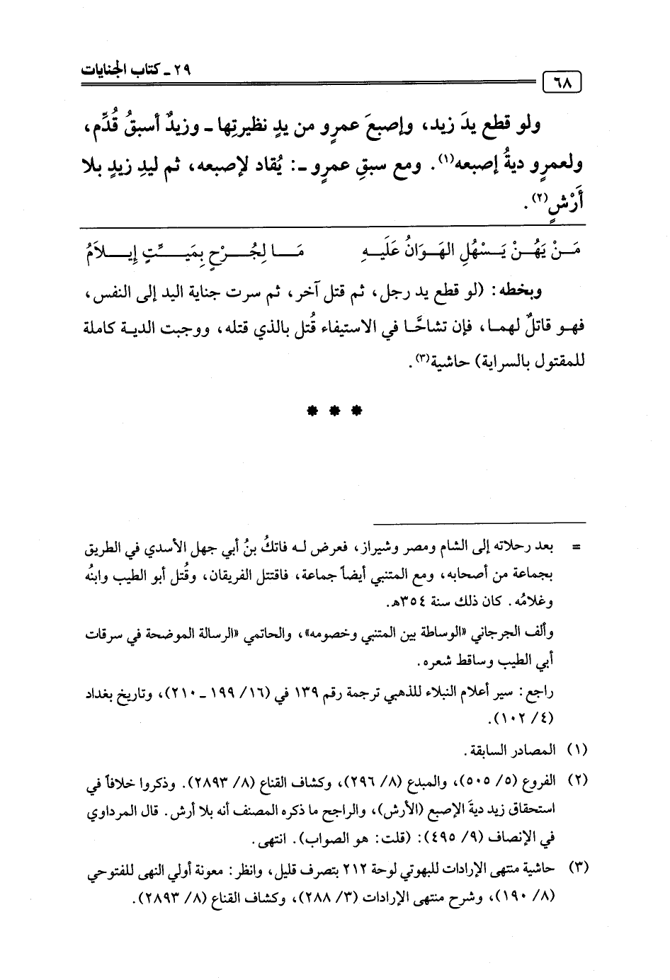 وبخطه: (لو قطع يد رجل، ثم قتل آخر، ثم سرت جناية اليد إلى النفس، فهو قاتلٌ لهما، فإن تشاحَّا في الاستيفاء قُتل بالذي قتله، ووجبت الدية كاملة للمقتول بالسراية) حاشية (¬3).