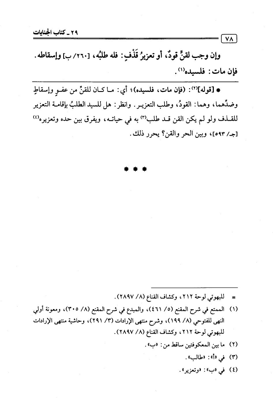 (¬1) الممتع في شرح المقنع (5/ 461)، والمبدع في شرح المقنع (8/ 305)، ومعونة أولي النهي للفتوحي (8/ 199)، وشرح منتهى الإرادات (3/ 291)، وحاشية منتهى الإرادات للبهوتي لوحة 212، وكشاف القناع (8/ 2897).