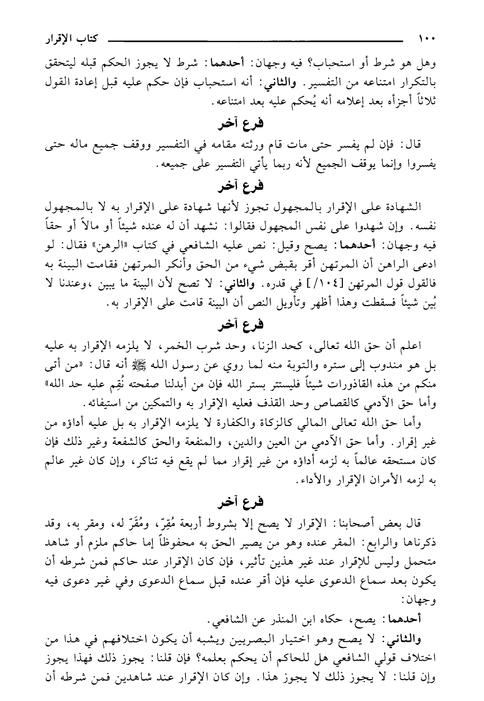 وهل هو شرط أو استحباب؟ فيه وجهان: أحدهما: شرط لا يجوز الحكم قبله ليتحقق بالتكرار امتناعه من التفسير. والثاني: أنه استحباب فإن حكم عليه قبل إعادة القول ثلاثاً أجزأه بعد إعلامه أنه يحكم عليه بعد امتناعه.