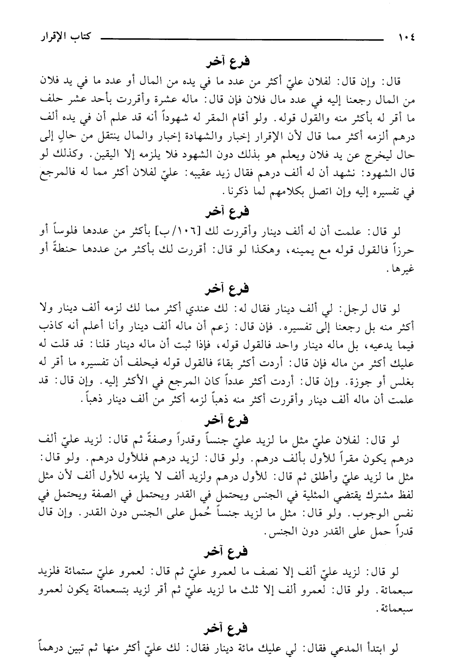 لو قال لرجل: لي ألف دينار فقال له: لك عندي أكثر مما لك لزمه ألف دينار ولا أكثر منه بل رجعنا إلى تفسيره. فإن قال: زعم أن ماله ألف دينار وأنا أعلم أنه كاذب فيما يدعيه، بل ماله دينار واحد فالقول قوله، فإذا ثبت أن ماله دينار قلنا: قد قلت له عليك أكثر من ماله فإن قال: أردت أكثر بقاءً فالقول قوله فيحلف أن تفسيره ما أقر له بغلس أو جوزة. وان قال: أردت أكثر عدداً كان المرجع في الأكثر إليه. وان قال: قد علمت أن ماله ألف دينار وأقررت أكثر منه ذهباً لزمه أكثر من ألف دينار ذهباً.