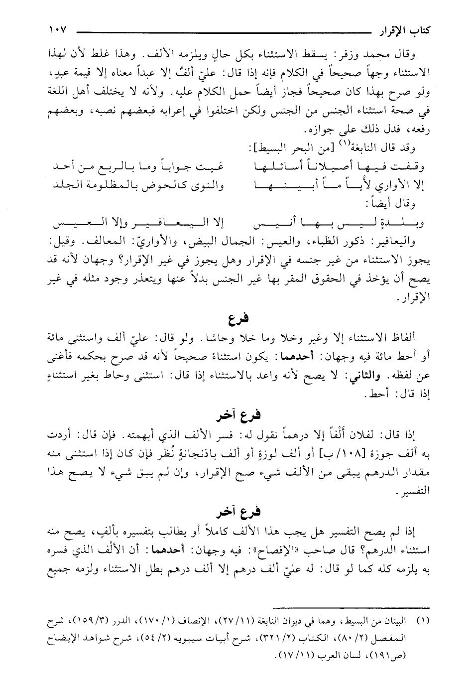 واليعافير: ذكور الظباء، والعيس: الجمال البيض، والأواريّ: المعالف. وقيل: يجوز الاستثناء من غير جنسه في الإقرار وهل يجوز في غير الإقرار؟ وجهان لأنه قد يصح أن يؤخذ في الحقوق المقر بها غير الجنس بدلاً عنها ويتعذر وجود مثله في غير الإقرار.