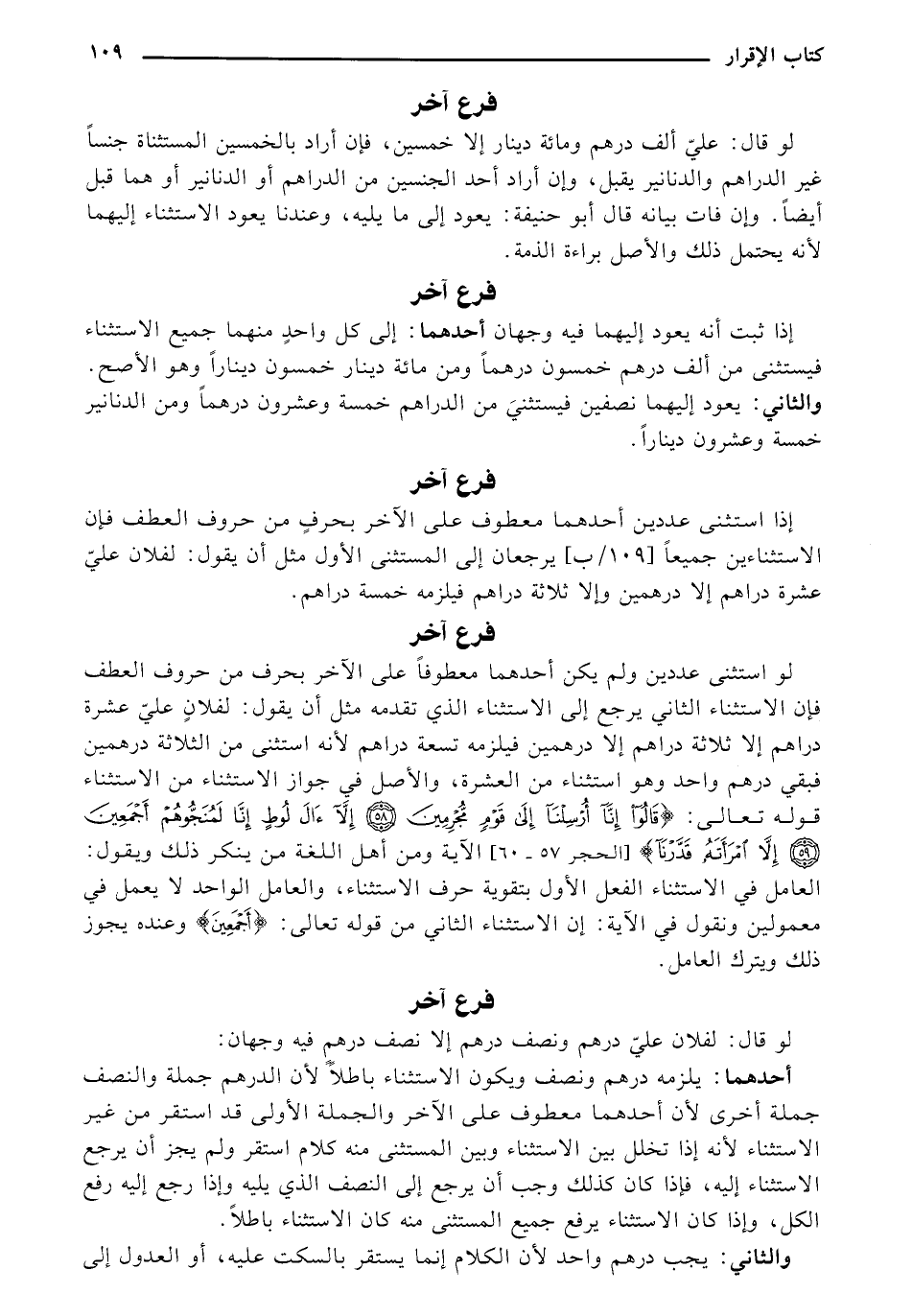 لو قال: عليّ ألف درهم ومائة دينار إلا خمسين، فإن أراد بالخمسين المستثناه جنساً غير الدراهم والدنانير يقبل، وان أراد أحد الجنسين من الدراهم أو الدنانير أو هما قبل أيضا. وان فات بيانه قال أبو حنيفة: يعود إلى ما يليه، وعندنا يعود الاستثناء إليهما لأنه يحتمل ذلك والأصل براءة الذمة.