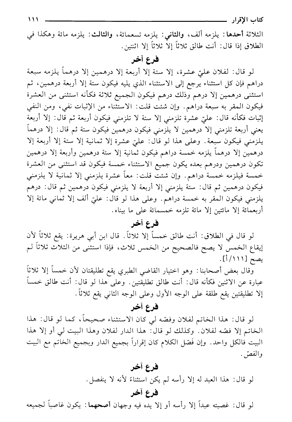 لو قال: لفلان علي عشرة، إلا ستة إلا أربعة إلا درهمين إلا درهماً يلزمه سبعة دراهم فإن كل استثناء يرجع إلى الاستثناء الذي يليه فيكون ستة إلا أربعة درهمين، ثم استثنى درهمين إلا درهم وذلك درهم فيكون الجميع ثلاثة فكأنه استثنى من العشرة فيكون المقر به سبعة دراهم. وإن شئت قلت: الاستثناء من الإثبات نفي، ومن النفي إثبات فكأنه قال: عليّ عشرة تلزمني إلا ستة لا تلزمني فيكون أربعة ثم قال: إلا أربعة يعني أربعة تلزمني إلا درهمين لا يلزمني فيكون درهمين فيكون ستة ثم قال: إلا درهماً يلزمني فيكون سبعة. وعلى هذا لو قال: عليّ عشرة إلا ثمانية إلا ستة إلا أربعة إلا درهمين إلا درهماً يلزمه خمسة دراهم فيكون ثمانية إلا ستة درهمين وأربعة إلا درهمين تكونن درهمين ودرهم بعده يكون جميع الاستثناء خمسة فيكون قد استثنى من العشرة خمسة فيلزمه خمسة دراهم. وان شئت قلت: معاً عشرة يلزمني إلا ثمانية لا يلزمني فيكون درهمين ثم قال: ستة يلزمني إلا أربعة لا يلزمني فيكون درهمين ثم قال: درهم يلزمني فيكون المقر به خمسة دراهم. وعلى هذا لو قال: عليّ ألف إلا ثماني مائة إلا أربعمائة إلا مائتين إلا مائة تلزمه خمسمائة على ما بيناه.