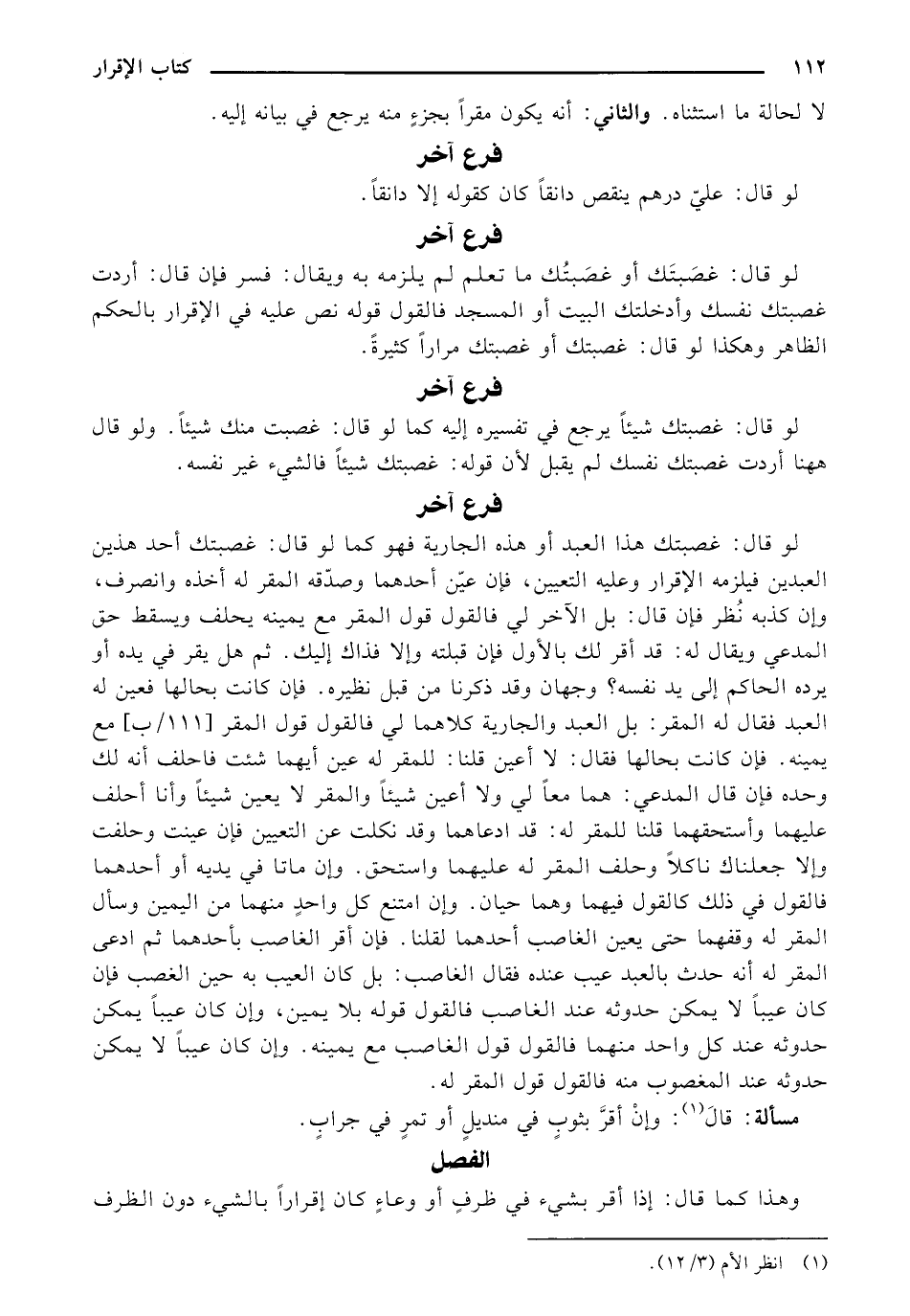 وهذا كما قال: إذا أقر بشيء في ظرفٍ أو وعاءٍ كان إقراراً بالشيء دون الظرف