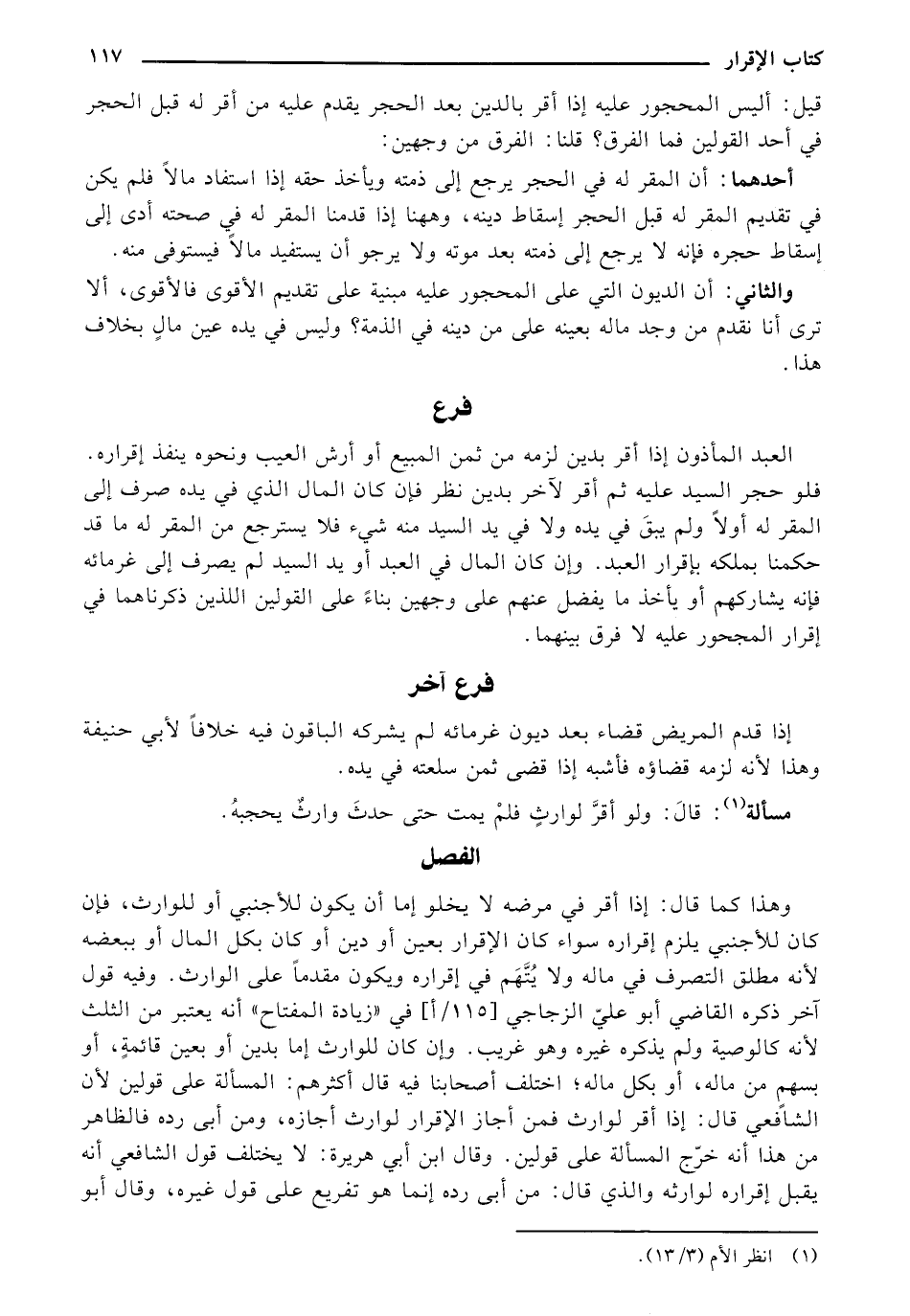 وهذا كما قال: إذا أقر في مرضه لا يخلو إما أن يكون للأجنبي أو للوارث، فإن كان للأجنبي يلزم إقراره سواء كان الإقرار بعين أو دين أو كان بكل المال أو ببعضه لأنه مطلق التصرف في ماله ولا يتهم في إقراره ويكون مقدماً على الوارث. وفيه قول آخر ذكره القاضي أبو علي الزجاجي [115/ أ] في "زيادة المفتاح " أنه يعتبر من الثلث لأنه كالوصية ولم يذكره غيره وهو غريب. وان كان للوارث إما بدين أو بعين قائمةٍ، أو بسهم من ماله، أو بكل ماله؟ اختلف أصحابنا فيه قال أكثرهم: المسألة على قولين لأن الشافعي قال: إذا أقر لوارث فمن أجاز الإقرار لوارث أجازه، ومن أبى رده فالظاهر من هذا أنه خرج المسألة على قولين. وقال ابن أبي هريرة: لا يختلف قول الشافعي أنه يقبل إقراره لوارثه والذي قال: من أبى رده إنما هو تفريع على قول غيره، وقال أبو
