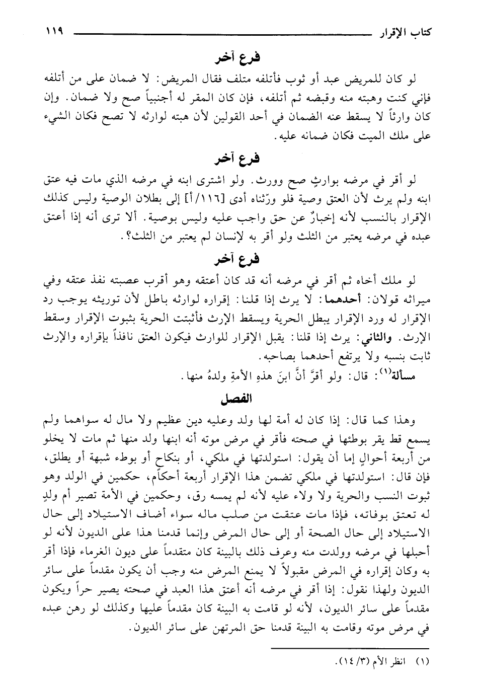 وهذا كما قال: إذا كان له أمة لها ولد وعليه دين عظيم ولا مال له سواهما ولم يسمع قط يقر بوطئها في صحته فأقر في مرض موته أنه ابنها ولد منها ثم مات لا يخلو من أربعة أحوال إما أن يقول: استولدتها في ملكي، أو بنكاح أو بوطء شبهة أو يطلق، فإن قال: استولدتها في ملكي تضمن هذا الإقرار أربعة أحكام، حكمين في الولد وهو ثبوت النسب والحرية ولا ولاء عليه لأنه لم يمسه رق، وحكمين في الأمة تصير أم ولد له تعتق بوفاته، فإذا مات عتقت من صلب ماله سواء أضاف الاستيلاد إلى حال الاستيلاد إلى حال الصحة أو إلى حال المرض وإنما قدمنا هذا على الديون لأنه لو أحبلها في مرضه وولدت منه وعرف ذلك بالبينة كان متقدماً على ديون الغرماء فإذا أقر به وكان إقراره في المرض مقبولاً لا يمنع المرض منه وجب أن يكون مقدماً على سائر الديون ولهذا نقول: إذا أقر في مرضه أنه أعتق هذا العبد في صحته يصير حراً ويكون مقدما على سائر الديون، لأنه لو قامت به البينة كان مقدماً عليها وكذلك لو رهن عبده في مرض موته وقامت به البينة قدمنا حق المرتهن على سائر الديون.