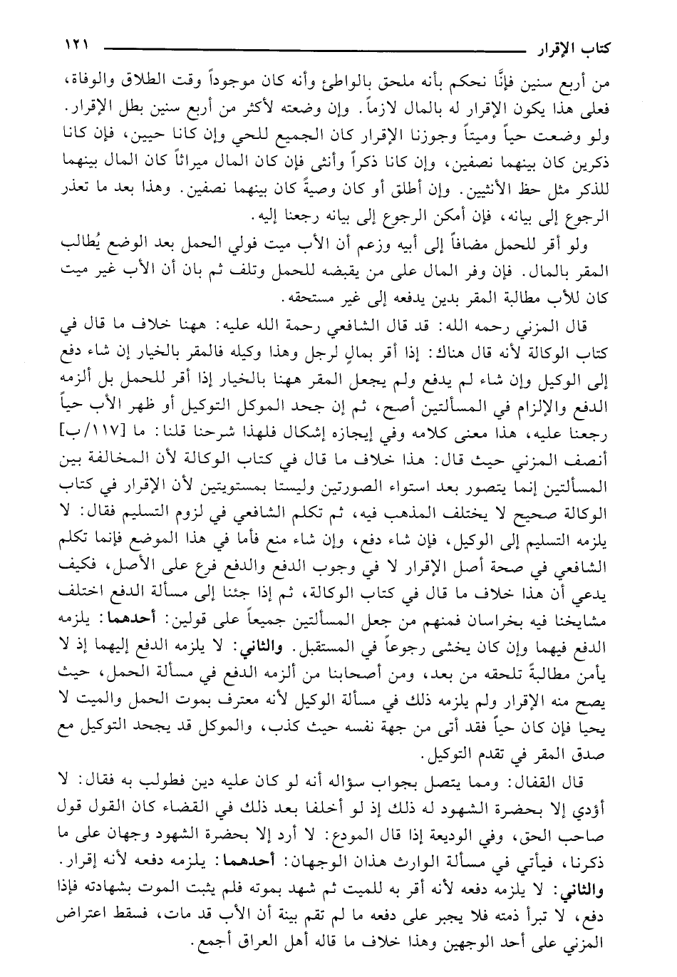 قال المزني رحمه الله: قد قال الشافعي رحمة الله عليه: ههنا خلاف ما قال في كتاب الوكالة لأنه قال هناك: إذا أقر بمال لرجل وهذا وكيله فالمقر بالخيار إن شاء دفع إلى الوكيل وان شاء لم يدفع ولم يجعل المقر ههنا بالخيار إذا أقر للحمل بل ألزمه الدفع والإلزام في المسألتين أصح، ثم إن جحد الموكل التوكيل أو ظهر الأب حياً رجعنا عليه، هذا معنى كلامه وفي إيجازه إشكال فلهذا شرحنا قلنا: ما [117/ ب] أنصف المزني حيث قال: هذا خلاف ما قال في كتاب الوكالة لأن المخالفة بين المسألتين إنما يتصور بعد استواء الصورتين وليستا بمستويتين لأن الإقرار في كتاب الوكالة صحيح لا يختلف المذهب فيه، ثم تكلم الشافعي في لزوم التسليم فقال: لا يلزمه التسليم إلى الوكيل، فإن شاء دفع، وان شاء منع فأما في هذا الموضع فإنما تكلم الشافعي في صحة أصل الإقرار لا في وجوب الدفع والدفع فرع على الأصل، فكيف يدعي أن هذا خلاف ما قال في كتاب الوكالة، ثم إذا جئنا إلى مسألة الدفع اختلف مشايخنا فيه بخراسان فمنهم من جعل المسألتين جميعا على قولين: أحدهما: يلزمه الدفع فيهما وان كان يخشى رجوعاً في المستقبل. والثاني: لا يلزمه الدفع إليهما إذ لا يأمن مطالبة تلحقه من بعد، ومن أصحابنا من ألزمه الدفع في مسألة الحمل، حيث يصح منه الإقرار ولم يلزمه ذلك في مسألة الوكيل لأنه معترف بموت الحمل والميت لا يحيا فإن كان حيا فقد أتى من جهة نفسه حيث كذب، والموكل قد يجحد التوكيل مع صدق المقر في تقدم التوكيل.