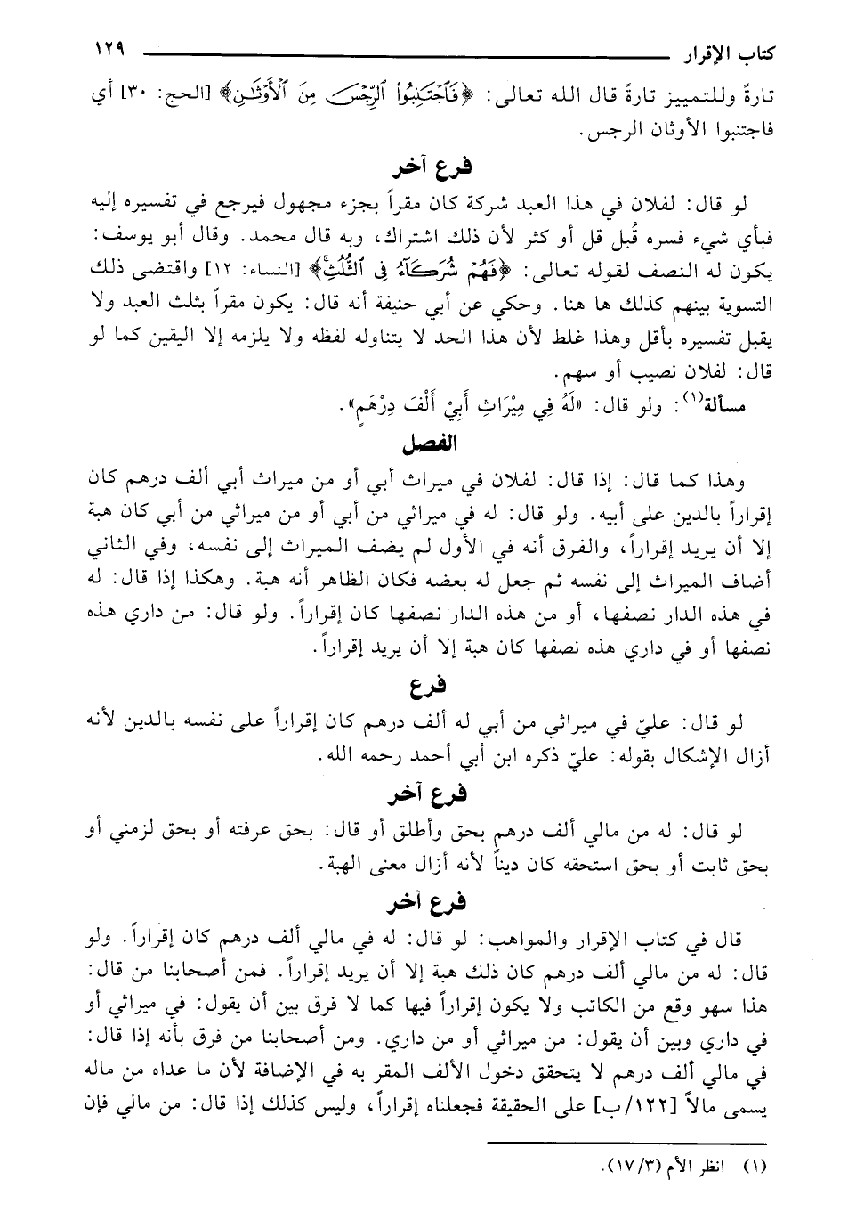 لو قال: علي في ميراثي من أبي له ألف درهم كان إقرارا على نفسه بالدين لأنه أزال الإشكال بقوله: عليّ ذكره ابن أبي أحمد رحمه الله.