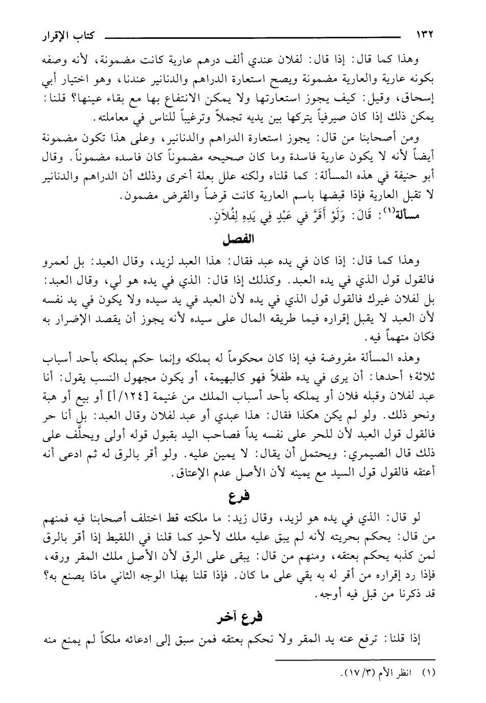 وهذه المسألة مفروضة فيه إذا كان محكوماً له بملكه وإنما حكم بملكه بأحد أسباب ثلاثة؟ أحدها: أن يرى في يده طفلاً فهو كالبهيمة، أو يكون مجهول النسب يقول: أنا عبد لفلان وقبله فلان أو يملكه بأحد أسباب الملك من غنيمة [124/ أ] أو بيع أو هبة ونحو ذلك. ولو لم يكن هكذا فقال: هذا عبدي أو عبد لفلان وقال العبد: بل أنا حر فالقول قول العبد لأن للحر على نفسه يداً فصاحب اليد بقبول توله أولى ويحلف على ذلك قال الصيمري: ويحتمل أن يقال: لا يمين عليه. ولو أقر بالرق له ثم ادعى أنه أعتقه فالقول قول السيد مع يميه لأن الأصل عدم الإعتاق.