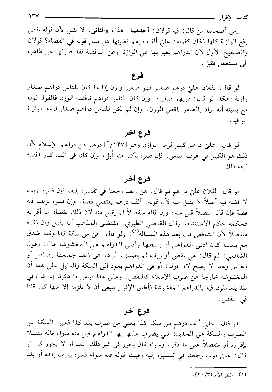ومن أصحابنا من قال: فيه قولان: أحدهما: هذا، والثاني: لا يقبل لأن قوله نقص رفع الوازنة كلها فكان كقوله: عليّ ألف درهم قضيتها هل يقبل قوله في القضاء؟ قولان والصحيح الأول لأن الدراهم يعبر بها عن الوازنة وعن الناقصة فقد صرفها عن ظاهره إلى مستعمل فقبل.