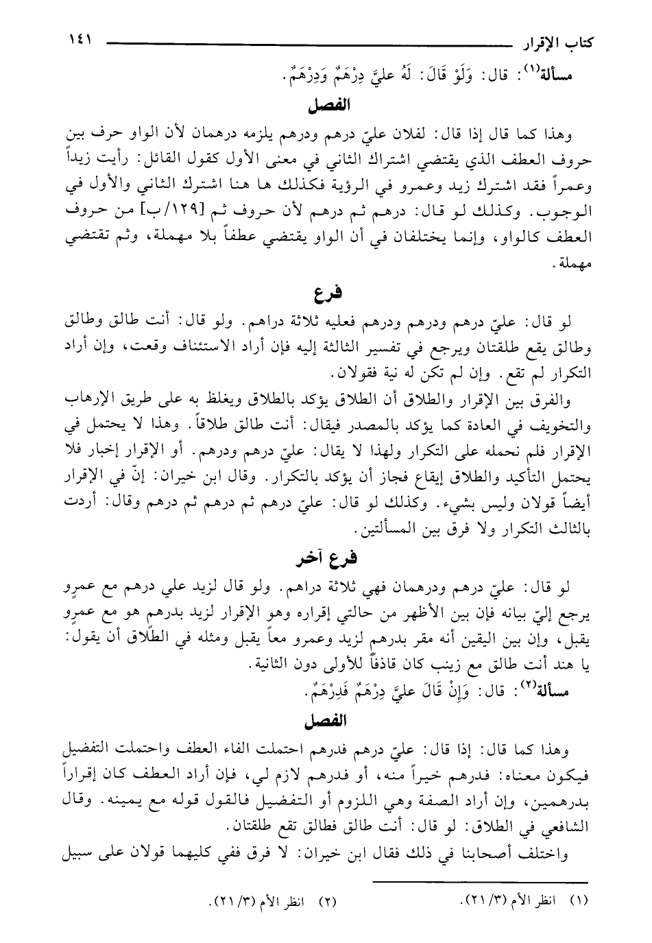 وهذا كما قال إذا قال: لفلان علي درهم ودرهم يلزمه درهمان لأن الواو حرف بين حروف العطف الذي يقتضي اشتراك الثاني في معنى الأول كقول القائل: رأيت زيداً وعمراً فقد اشترك زيا وعمرو في الرؤية فكذلك ها هنا اشترك الثاني والأول في الوجوب. وكذلك لو قال: درهم ثم درهم لأن حروف ثم [129/ ب] من حروف العطف كالواو، وإنما يختلفان في أن الواو يقتضي عطفاً بلا مهملة، وثم تقتضي مهملة.