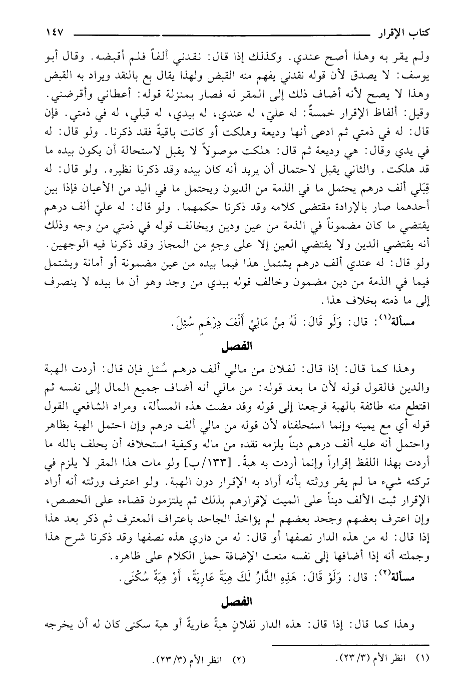 وهذا كما قال: إذا قال: لفلان من مالي ألف درهم سئل فإن قال: أردت الهبة والدين فالقول قوله لأن ما بعد قوله: من مالي أنه أضاف جميع المال إلى نفسه ثم اقتطع منه طائفة بالهبة فرجعنا إلى قوله وقد مضت هذه المسألة، ومراد الشافعي القول قوله أي مع يمينه وإنما استحلفناه لأن قوله من مالي ألف درهم وإن احتمل الهبة بظاهر واحتمل أنه عليه ألف درهم ديناً يلزمه نقده من ماله وكيفية استحلافه أن يحلف بالله ما أردت بهذا اللفظ إقراراً وإنما أردت به هبة. [133/ ب] ولو مات هذا المقر لا يلزم في تركته شيء ما لم يقر ورثته بأنه أراد به الإقرار دون الهبة. ولو اعترف ورثته أنه أراد الإقرار ثبت الألف ديناً على الميت لإقرارهم بذلك ثم يلتزمون قضاءه على الحصص، وان اعترف بعضهم وجحد بعضهم لم يؤاخذ الجاحد باعتراف المعترف ثم ذكر بعد هذا إذا قال: له من هذه الدار نصفها أو قال: له من داري هذه نصفها وقد ذكرنا شرح هذا وجملته أنه إذا أضافها إلى نفسه منعت الإضافة حمل الكلام على ظاهره.