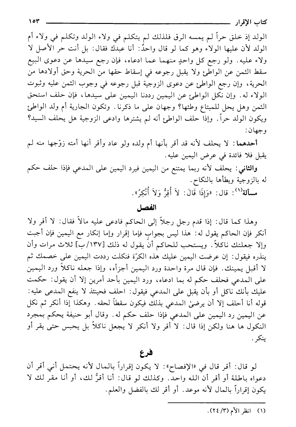 لو قال: أقر قال في (الإفصاح): لا يكون إقرارًا بالمال لأنه يحتمل أني أقر أن دعواه باطلة أو أقر أن الله واحد. وكذلك لو قال: أنا أقرُّ لك، أو أنا مقر لك لا يكون إقرارًا بالمال لأنه موعد. أو أقر لك بالفضل والعلم.