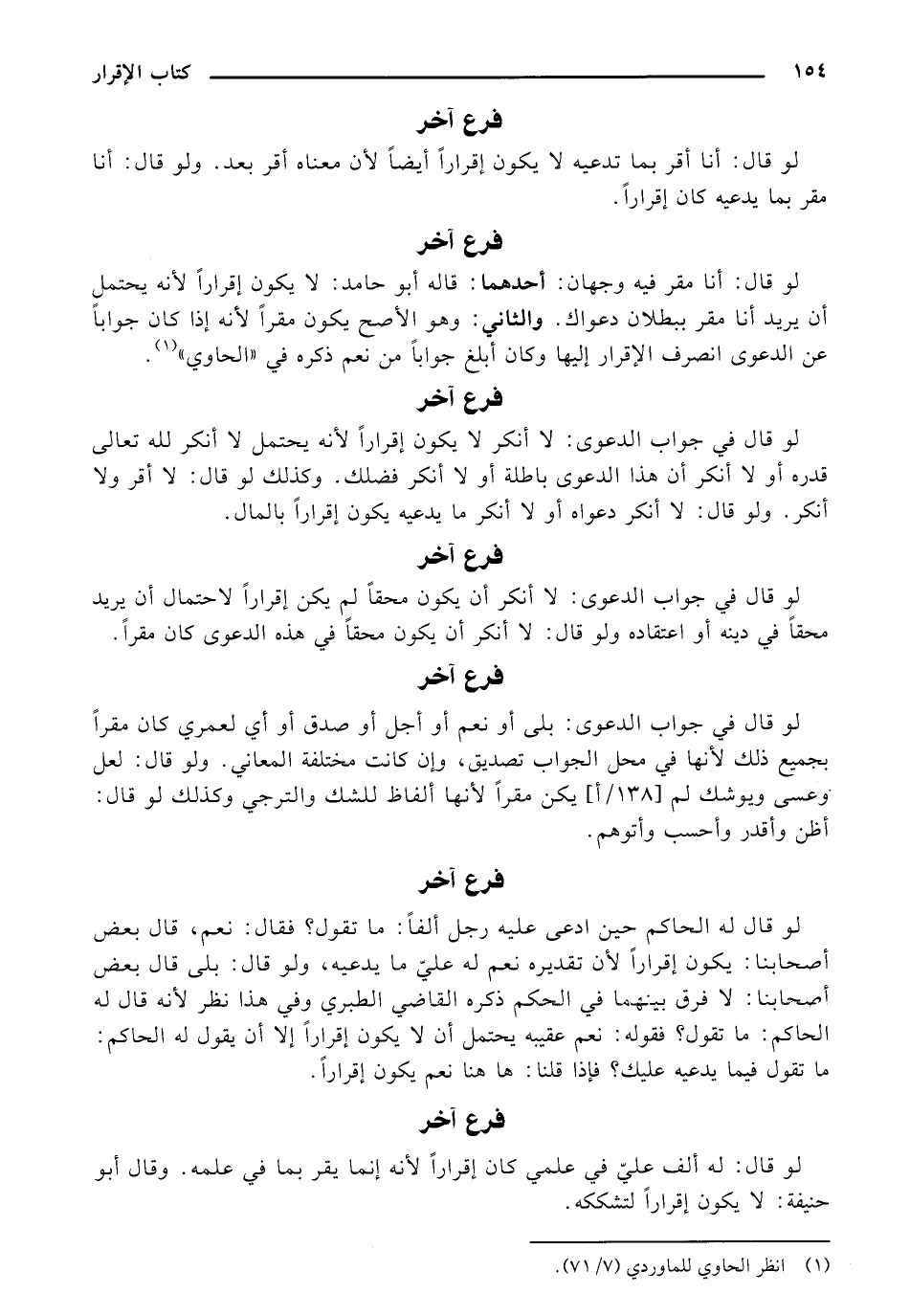 لو قال في جواب الدعوي: لا أنكر لا يكون إقرارًا لأنه يحتمل لا أنكر لله تعالى قدره أو لا أنكر أنه هذا الدعوى باطلة أو لا أنكر فضلك. وكذلك لو قال: لا أقر ولا أنكر. ولو قال: لا أنكر دعواه أو لا أنكر ما يدعيه يكون إقرارًا بالمال.
