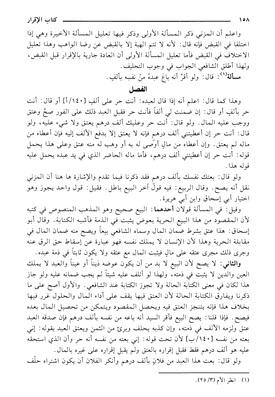 وقيل: في المسألة قولان أحدهما: البيع صحيح وهو المذهب المنصوص في كتبه لأن المقصود من هذا البيع الحرية بعوض يثبت في الذمة فأشبه الكتابة. وقال أبو إسحاق: هذا عتق بشرط ضمان المال وسماه الشافعي بيعًا ويصح منه ضمان المال في مقابلة الحرية وهذا لأن الإنسان لا يملك نفسه فهو عبارة عن إسقاط حق الرق عنه وجرى ذلك مجرى عتقه على ماٍل فيثبت المال مع عتقه ولا يكون ثابتًا قي ذمة عبده.