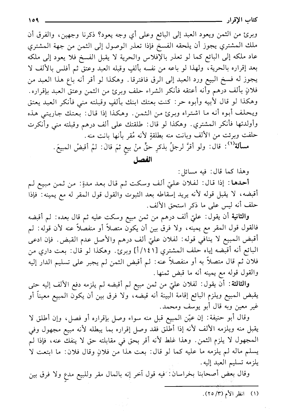 والثالثة: أن يقول: لفلان علّي من ثمن مبيع لم أقبضه لم يلزمه دفع الألف إليه حتى يقبض المبيع ويلزم البائع إقامة البينة أنه قبضه، ولا فرق بين أن يكون المبيع معينًا أو غير معين وبه قال أبو يوسف ومحمد.