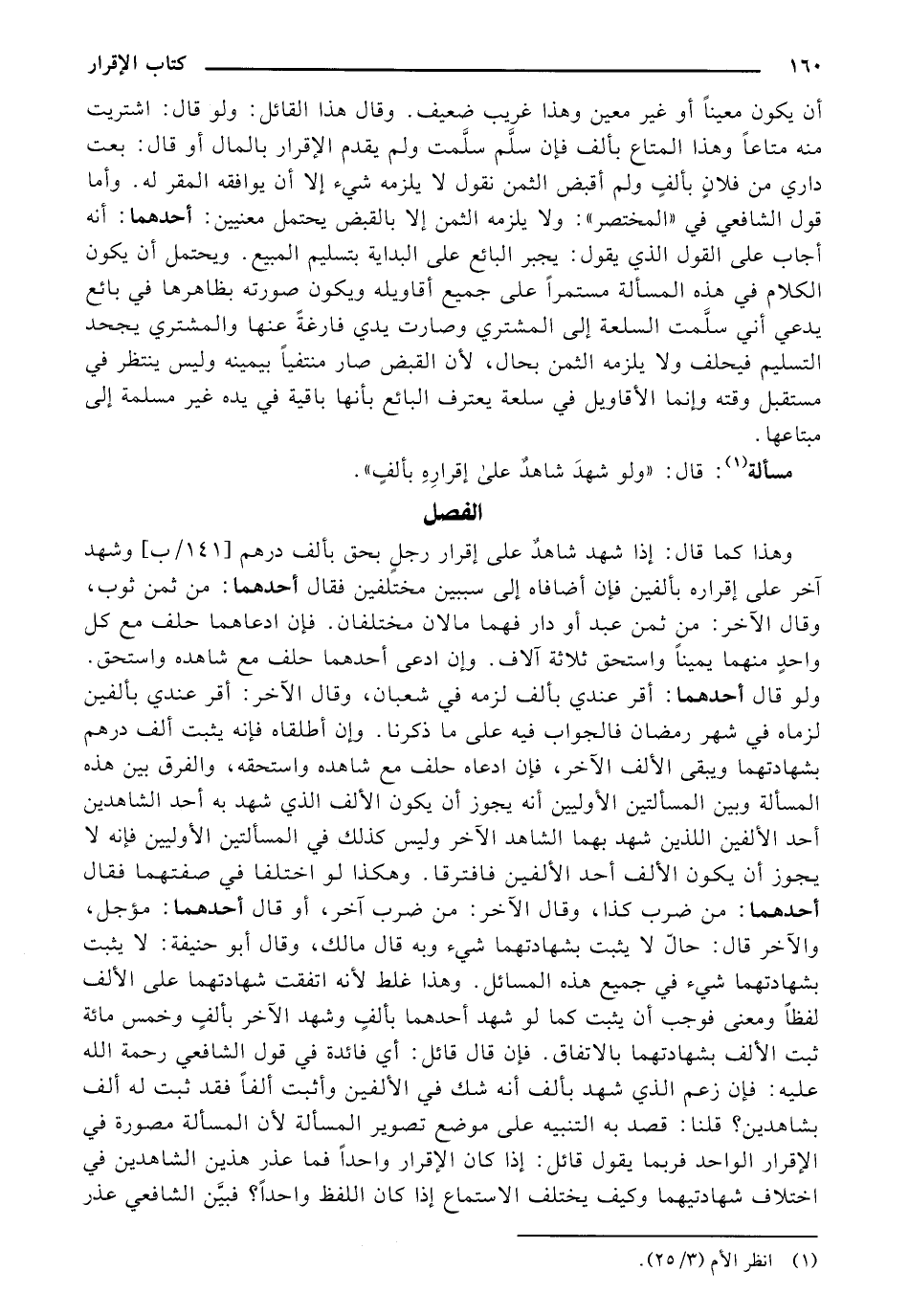 وهذا كما قال: إذا شهد شاهٌد على إقرار رجٍل بحق بألف درهم (141/ب] وشهد آخر على إقراره بألفين فإن أضافاه إلى سببين مختلفين فقال أحدهما: من ثمن ثوب، وقال الآخر: من ثمن عبد أو دار فهما مالان مختلفان. فإن ادعاهما حلف مع كل واحٍد منهما يمينًا واستحق ثلاثة آلاف. وإن ادعى أحدهما حلف مع شاهده واستحق. ولو قال أحدهما: أقر عندي بألف لزمه في شعبان، وقال الآخر: أقر عندي بألفين لزماه في شهر رمضان فالجواب فيه على ما ذكرنا. وإن أطلقاه فإنه يثبت ألف درهم بشهادتهما ويبقى الألف الآخر، فإن ادعاه حلف مع شاهده واستحقه، والفرق بين هذه المسألة وبين المسألتين الأوليين أنه يجوز أن يكون الألف الذي شهد به أحد الشاهدين أحد الألفين اللذين شهد بهما الشاهد الآخر وليس كذلك في المسألتين الأوليين فإنه لا يجوز أن يكون الألف أحد الألفين فافترقا. وهكذا لو اختلفا في صفتهما فقال أحدهما: من ضرب كذا، وقال الآخر: من ضرب آخر، أو قال أحدهما: مؤجل، والآخر قال: حال لا يثبت بشهادتهما شيء وبه قال مالك، وقال أبو حنيفة: لا يثبت بشهادتهما شيء في جميع هذه المسائل. وهذا غلط لأنه اتفقت شهادتهما على الألف لفظًا ومعنى فوجب أن يثبت كما لو شهد أحدهما بألٍف وشهد الآخر بألٍف وخمس مائة ثبت الألف بشهادتهما بالاتفاق. فإن قال قائل: أي فائدة في قول الشافعي رحمة الله عليه: فإن زعم الذي شهد بألف أنه شك في الألفين وأثبت ألفًا فقد ثبت له ألف بشاهدين؟ قلنا: قصد به التنبيه على موضع تصوير المسألة لأن المسألة مصورة في الإقرار الواحد فربما يقول قائل: إذا كان الإقرار واحدًا فما عذر هذين الشاهدين في اختلاف شهادتيهما وكيف يختلف الاستماع إذا كان اللفظ واحدًا؟ فبَّين الشافعي عذر