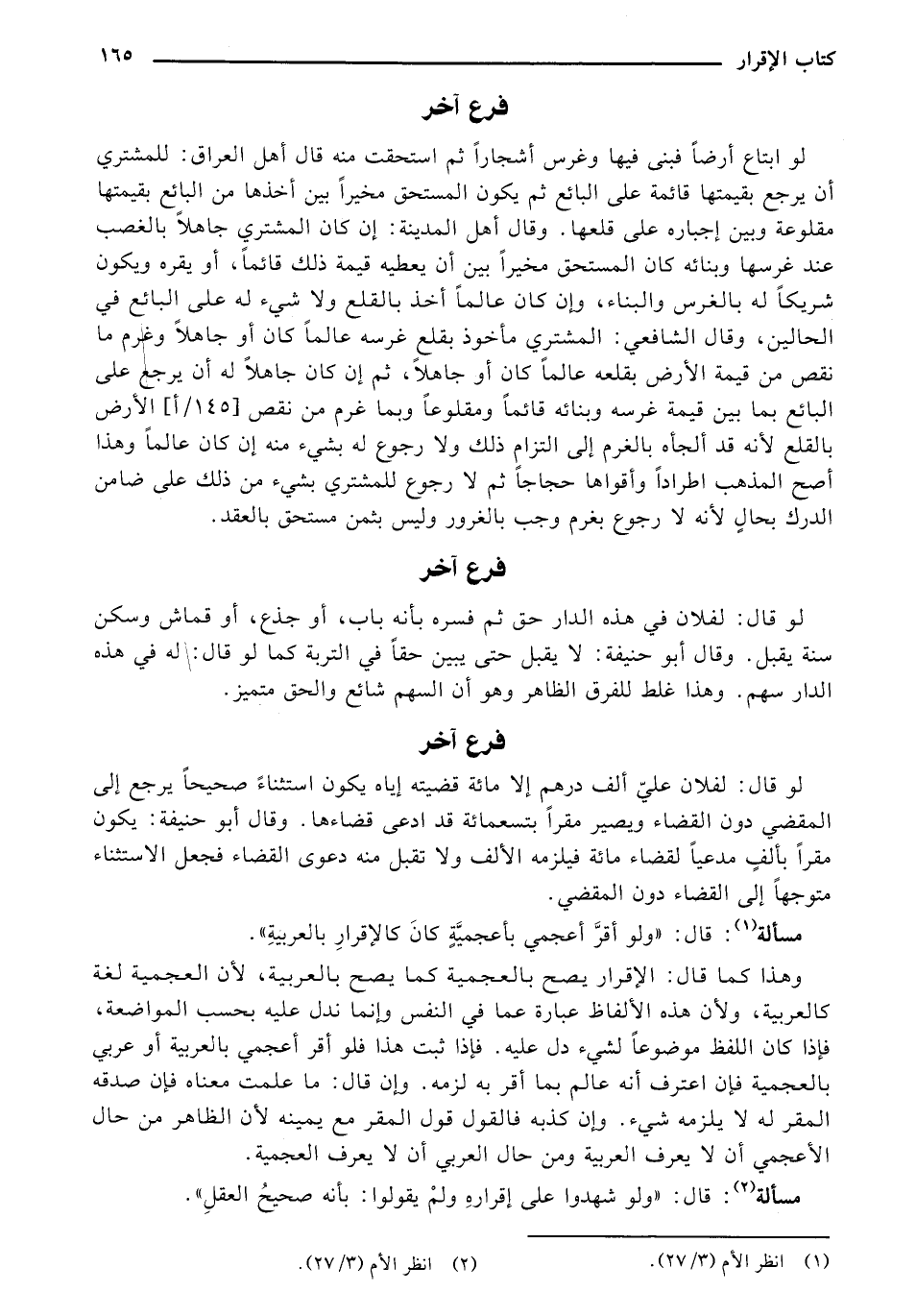 لو قال: لفلان علّي ألف درهٍم إلا مائة قضيته إياه يكون استثناًء صحيحًا يرجع إلى المقضي دون القضاء ويصير مقرًا بتسعمائة قد ادعى قضاءها. وقال أبو حنيفة: يكون مقرًا بألٍف مدعيًا لقضاء مائة فيلزمه الألف ولا تقبل منه دعوى القضاء فجعل الاستثناء متوجهًا إلى القضاء دون المقضي.