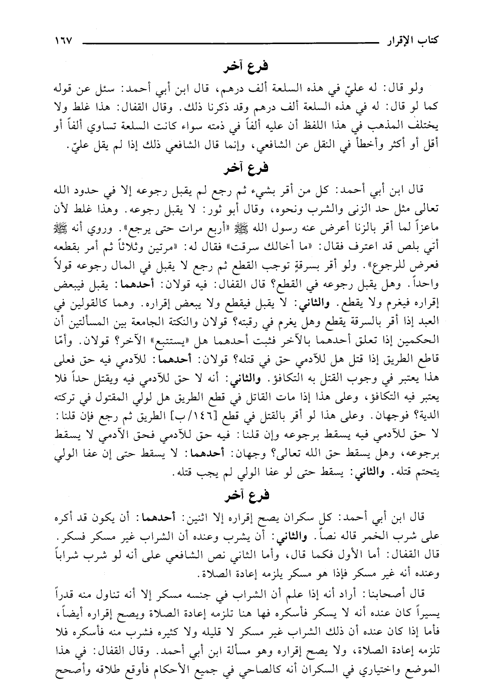 قال ابن أبي أحمد: كل من أقر بشيء ثم رجع لم يقبل رجوعه إلا في حدود الله تعالى مثل حد الزنى والشرب ونحوه، وقال أبو ثور: لا يقبل رجوعه. وهذا غلط لأن ماعزًا لما أقر بالزنا أعرض عنه رسول الله - صلى الله عليه وسلم - (أربع مرات حتى يرجع). وروي أنه - صلى الله عليه وسلم - أتي بلص قد اعترف فقال: (ما أخالك سرقت) فقال له: (مرتين وثلاثًا ثم أمر بقطعه فعرض للرجوع). ولو أقر بسرقٍة توجب القطع ثم رجع لا يقبل في المال رجوعه قوًلا واحدًا. وهل يقبل رجوعه في القطع؟ قال القفال: فيه قولان: أحدهما: يقبل فيبعض إقراره فيغرم ولا يقطع. والثاني: لا يقبل فيقطع ولا يبعض إقراره. وهما كالقولين في العبد إذا أقر بالسرقة يقطع وهل يغرم في رقبته؟ قولان والنكتة الجامعة بين المسألتين أن الحكمين إذا تعلق أحدهما بالآخر فثبت أحدهما هل (يستتبع) الآخر؟ قولان. وأما قاطع الطريق إذا قتل هل للآدمي حق في قتله؟ قولان: أحدهما: للآدمي فيه حق فعلى هذا يعتبر في وجوب القتل به التكافؤ. والثاني: أنه لا حق للآدمي فيه ويقتل حدًا فلا يعتبر فيه التكافؤ، وعلى هذا إذا مات القاتل في قطع الطريق هل لولي المقتول في تركته الدية؟ فوجهان. وعلى هذا لو أقر بالقتل في قطع [146/ ب] الطريق ثم رجع فإن قلنا: لا حق للآدمي فيه يسقط برجوعه وإن قلنا: فيه حق للآدمي فحق الآدمي لا يسقط برجوعه، وهل يسقط حق الله تعالى؟ وجهان: أحدهما: لا يسقط حتى إن عفا الولي يتحتم قتله. والثاني: يسقط حتى لو عفا الولي لم يجب قتله.