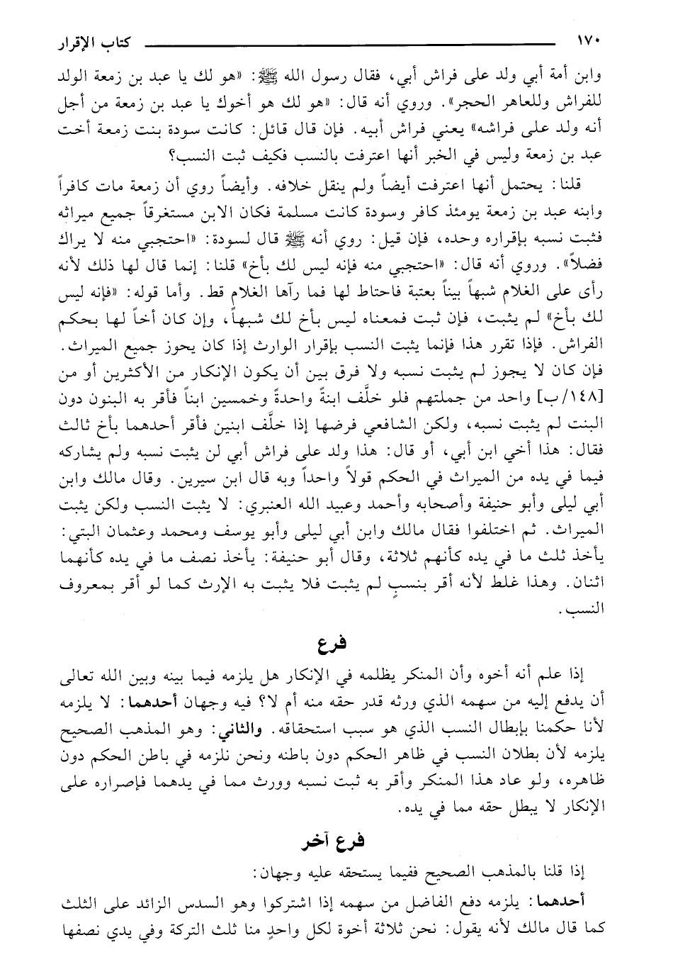 وابن أمة أبي ولد على فراش أبي، فقال رسول الله - صلى الله عليه وسلم -: (هو لك يا عبد بن زمعة الولد للفراش وللعاهر الحجر). وروي أنه قال: (هو لك هو أخوك يا عبد بن زمعة من أجل أنه ولد على فرا شه) يعني فراش أبيه، فإن قال قائل: كانت سودة بنت زمعة أخت عبد بن زمعة وليس في الخبر أنها اعترفت بالنسب فكيف ثبت النسب؟