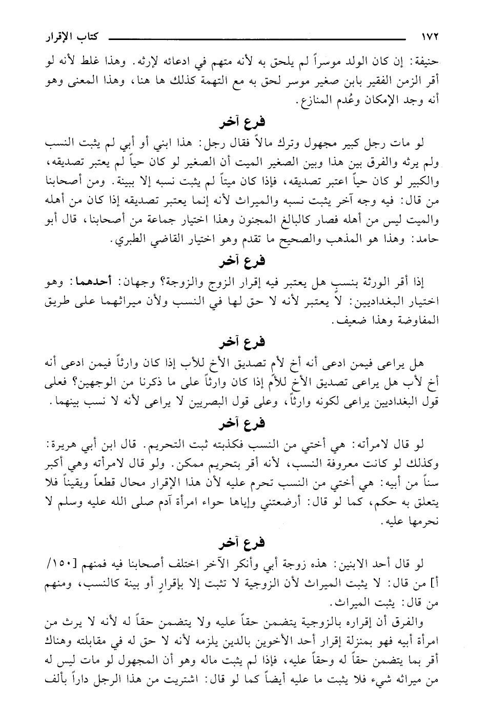 إذا أقر الورثة بنسٍب هل يعتبر فيه إقرار الزوج والزوجة؟ وجهان: أحدهما: وهو اختيار البغداديين: لا يعتبر لأنه لا حق لها في النسب ولأن ميراثهما على طريق المفاوضة وهذا ضعيف.