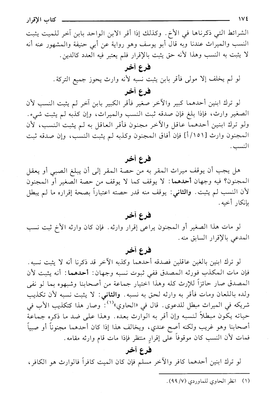 هل يجب أن يوقف ميراث المقر به من حصة المقر إلى أن يبلغ الصبي أو يعقل المجنون؟ فيه وجهان أحدهما: لا يوقف كما لا يوقف من حصة الصغير أو المجنون لأن النسب لم يثبت. والثاني: يوقف منه قدر حصته اعتبارًا بصحة إقراره ما لم يبطل بإنكار أخيه.