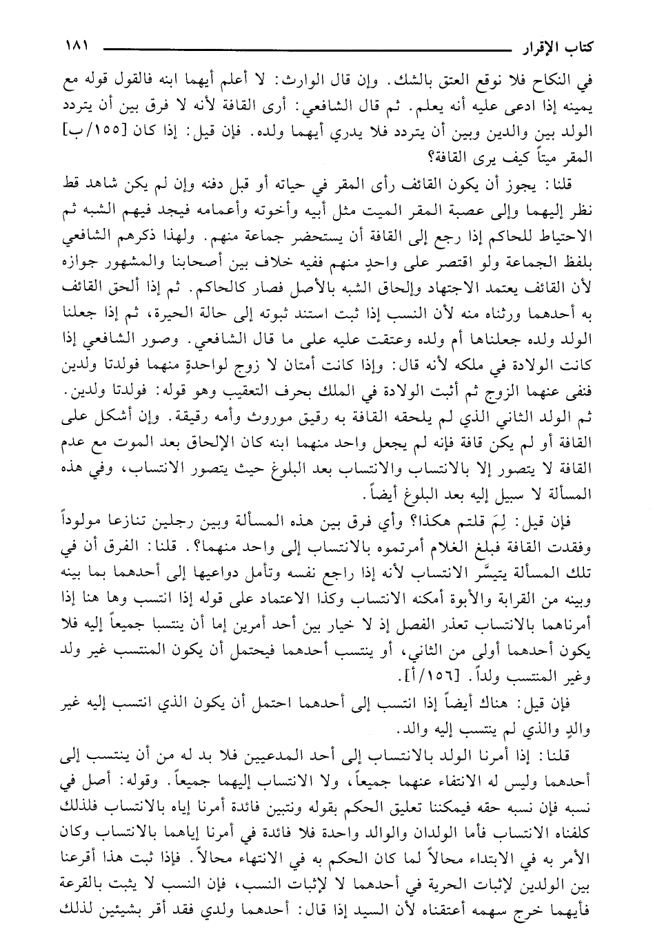 في النكاح فلا نوقع العتق بالشك. وإن قال الوارث: لا أعلم أيهما ابنه فالقول قوله مع يمينه إذا ادعى عليه أنه يعلم. ثم قال الشافعي: أرى القافة لأنه لا فرق بين أن يتردد الولد بين والدين وبين أن يتردد فلا يدري أيهما ولده. فإن قيل: إذا كان [155/ب] المقر ميتًا كيف يرى القافة؟