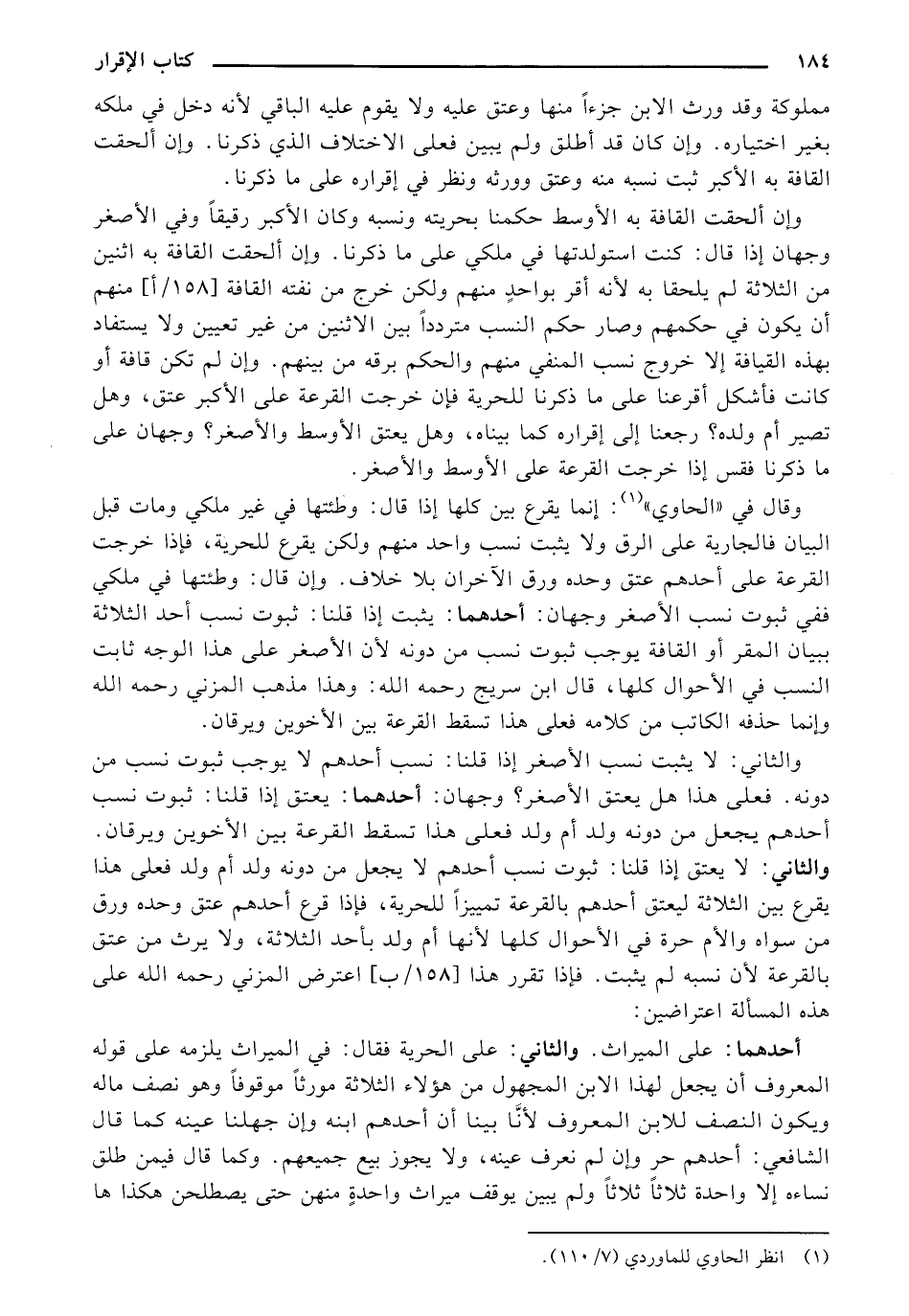 والثاني: لا يثبت نسب الأصغر إذا قلنا. نسب أحدهم لا يوجب ثبوت، نسب من دونه. فعلى هذا هل يعتق الأصغر؟ وجهان: أحدهما: يعتق إذا قلنا: ثبوت نسب أحدهم يجعل من دونه ولد أم ولد فعلى هذا تسقط القرعة بين الأخوين ويرقان. والثاني: لا يعتق إذا قلنا: ثبوت نسب أحدهم لا يجعل من دونه ولد أم ولد فعلى هذا يقرع بين الثلاثة ليعتق أحدهم بالقرعة تمييزًا للحرية، فإذا قرع أحدهم عتق وحده ورق من سواه والأم حرة في الأحوال كلها لأنها أم ولد بأحد الثلاثة، ولا يرث من عتق بالقرعة لأن نسبه لم يثبت. فإذا تقرر هذا [158/ب] اعترض المزني رحمه الله على هذه المسألة اعتراضين: