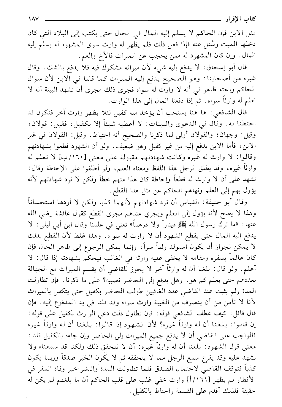 وقال أبو حنيفة: القياس أن ترد شهادتهم لأنهما كذبا ولكن لا أردها استحساناً وهذا لا يصح لأنه يؤول إلى العلم ويجري عندهم مجرى القطع كقول عائشة رضي الله عنها: "ما ترك رسول الله - صلى الله عليه وسلم - ديناراً ولا درهماً" تعني في علمنا وقال ابن أبي ليلى: لا يدفع إليه المال حتى يقطع الشهود أن لا وارث له سواه. وهذا غلط لأن القطع بذلك لا يمكن لجواز أن يكون استولد ولداً سراً، وإنما يمكن الرجوع إلى ظافر الحال فإن كان عالماً بسفره ومقامه لا يخفى عليه وارثه في الغالب فيحكم بشهادته إذا قال: لا أعلم. ولو قال: بلغنا أن له وارثاً آخر لا يجوز للقاضي أن يقسم الميراث مع الجهالة بعددهم حتى يعلم كم هو. وهل يدفع إلى الحاضر نصيبه؟ على ما ذكرنا. فإن تطاولت المدة ولم يثبت عند القاضي عدد الغائبين طولب الحاضر بكفيل حتى يتكفل بالميراث لأنا لا نأمن من أن ينصرف من الغيبة وارث سواه وقد قلنا في يد المدفوع إليه. فإن قال قائل: كيف عطف الشافعي قوله: فإن تطاول ذلك دعي الوارث بكفيل على قوله: إن قالوا: بلغنا أن له وارثاً غيره؟ لأن الشهود إذا قالوا: بلغنا أن له وارثاً غيره فالواجب على القاضي أن لا يدفع جميع الميراث إلى الحاضر وإن جاءه بالكفيل قلنا: معنى قول الشهود: بلغنا أن له وارثاً غيره: أن لا نتحقق ذلك ولكنا قد سمعناه ولا نشهد عليه وقد يقرع سمع الرجل مما لا يتحققه ثم لا يكون الخبر صدقاً وربما يكون كذباً فتوقف القاضي لاحتمال الصدق فلما تطاولت المدة وانتشر خبر وفاة المقر في الأقطار لم يظهر [161/أ] وارث خفي غلب على قلب الحاكم أن ما بلغهم لم يكن له حقيقة فلذلك أقدم على القسمة واحتاط بالكفيل.