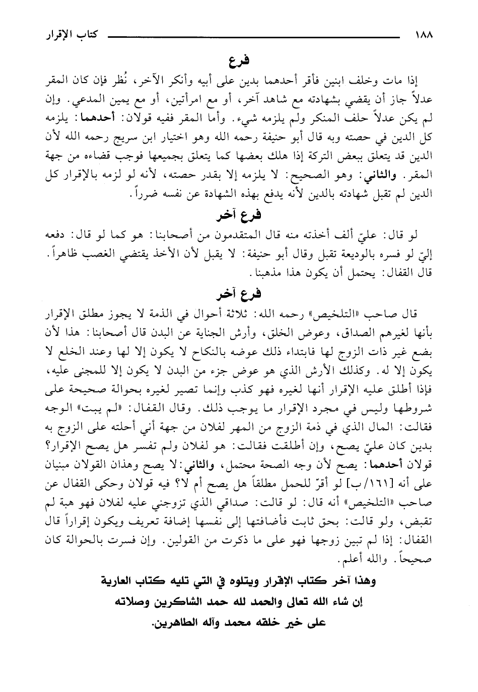 وهذا آخر كتاب الإقرار ويتلوه في التي تليه كتاب العارية إن شاء الله تعالى والحمد لله حمد الشاكرين وصلاته على خير خلقه محمد وآله الطاهرين.
