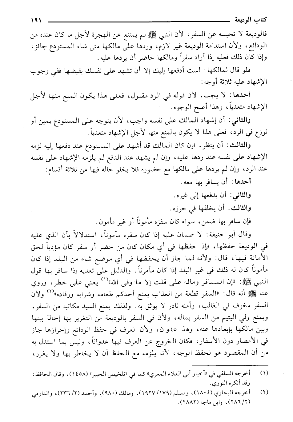 وقال أبو حنيفة: لا ضمان عليه إذا كان سفره مأموناً، استدلالاً بأن الذي عليه في الوديعة حفظها، فإذا حفظها في أي مكان كان من حضر أو سفر كان مؤدياً لحق الأمانة فيها، قال: ولأنه لما جاز أن يحفظها في أي موضع شاء من البلاد إذا كان مأموناً كان له ذلك في غير البلد إذا كان مأموناً. والدليل على تعديه إذا سافر بها قول النبي - صلى الله عليه وسلم -: "إن المسافر وماله على قلت إلا ما وقى الله" (¬1) يعني على خطر، وروي عنه - صلى الله عليه وسلم - أنه قال: "السفر قطعة من العذاب يمنع أحدكم طعامه وشرابه ورقاده" (¬2) ولان السفر مخوف في الغالب، وأمنه نادر لا يوثق به. ولذلك يمنع السيد مكاتبه من السفر، ويمنع ولي اليتيم من السفر بماله، ولأن في السفر بالوديعة من التغرير بها إحالة بينها وبين مالكها بإبعادها عنه، وهذا عدوان، ولأن العرف في حفظ الودائع وإحرازها جاز في الأمصار دون الأسفار، فكان الخروج عن العرف فيها عدواناً، وليس بما استدل به من أن المقصود هو لحفظ الوجه، لأنه يلزمه مع الحفظ أن لا يخاطر بها ولا يغرر،