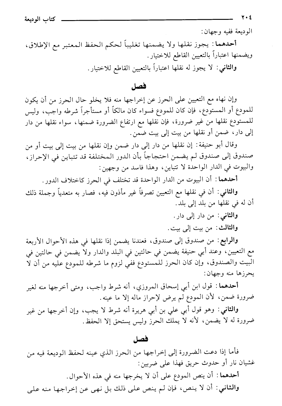 وإن نهاه مع التعيين على الحرز عن إخراجها منه فلا يخلو حال الحرز من أن يكون للمودع أو المستودع، فإن كان للمودع فسواء كان مالكاً أو مستأجراً شرطه واجب، وليس للمستودع نقلها من غير ضرورة، فإن نقلها مع ارتفاع الضرورة ضمنها، سواء نقلها من دار إلى دار، ضمن أو نقلها من بيت إلى بيت ضمن.