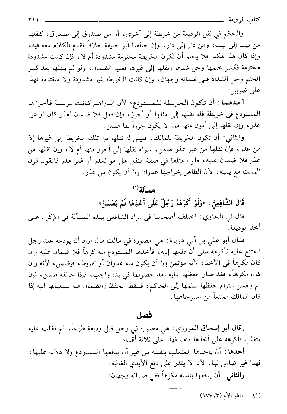 وقال أبو إسحاق المروزي: هي مصورة في رجل تبل وديعة طوعاً، ثم تغلب عليه متغلب فأكرهه على أخذها منه، فهذا على ثلاثة أقسام: