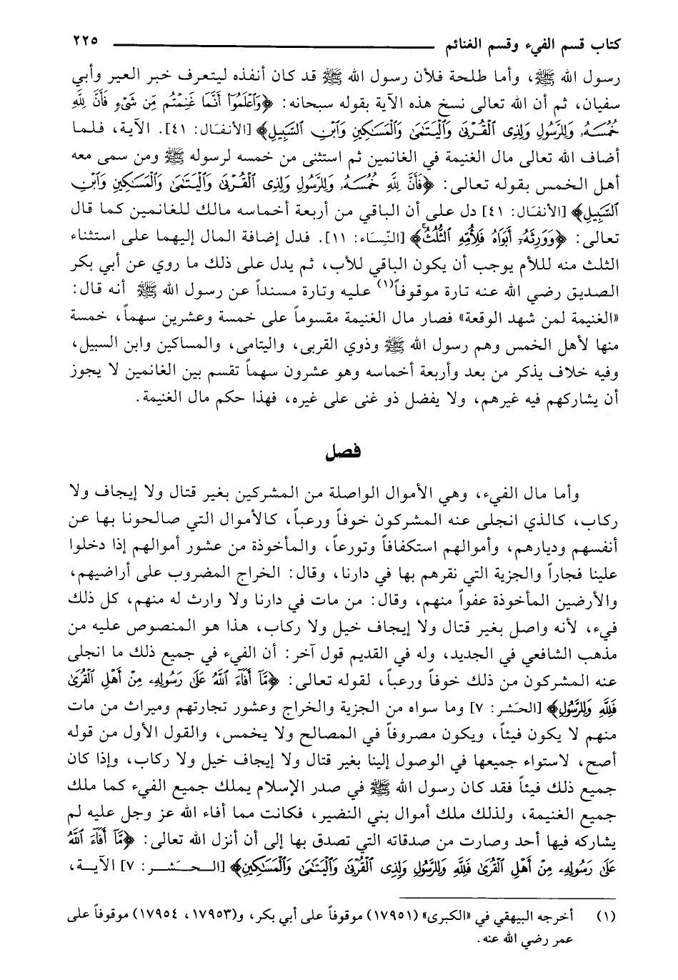 رسول الله - صلى الله عليه وسلم -، وأما طلحة فلأن رسول الله - صلى الله عليه وسلم - قد كان أنفذه ليتعرف خبر العير وأبي سفيان، ثم أن الله تعالى نسخ هذه الآية بقوله سبحانه: أضاف إنه تعالى مال الغنيمة في الغانمين ثم استثنى من خمسه لرسوله س ومن سمى معه أهل الخمس بقوله تعالى: {وَاعْلَمُوا أَنَّمَا غَنِمْتُمْ مِنْ شَيْءٍ فَأَنَّ لِلَّهِ خُمُسَهُ وَلِلرَّسُولِ وَلِذِي الْقُرْبَى وَالْيَتَامَى وَالْمَسَاكِينِ وَابْنِ السَّبِيلِ} [الأنفال: 41]. الآية، فلما أضاف الله تعالى مال الغنيمة في الغانمين ثم استثنى من خمسة لرسول - صلى الله عليه وسلم - ومن سمى معه أهل الخمس بقوله تعالى: {فَأَنَّ لِلَّهِ خُمُسَهُ وَلِلرَّسُولِ وَلِذِي الْقُرْبَى وَالْيَتَامَى وَالْمَسَاكِينِ وَابْنِ السَّبِيلِ} [الأنفال: 41] دل على أن الباقي من أربعة أخماسه مالك للغانمين كما قال تعالى: {وَوَرِثَهُ أَبَوَاهُ فَلِأُمِّهِ الثُّلُث} [النساء:11]. فدل إضافة المال إليهما على استثناء الثلث منه لللأم يوجب أن يكون الباقي للأب، ثم يدل على ذلك ما روي عن أبي بكر الصديق - رضي الله عنه - تارة موقوفاً (¬1) عليه وتارة مسنداً عن رسول الله - صلى الله عليه وسلم - أنه قال: "الغنيمة لمن شهد الوقعة" فصار مال الغنيمة مقسوماً على خمسة وعشرين سهماً، خمسة منها لأهل الخمس وهم رسول الله - صلى الله عليه وسلم - وذوي القربى، واليتامى، والمساكين وابن السبيل، وفيه خلاف يذكر من بعد وأربعة أخماسه وهو عشرون سهماً تقسم بين الغانمين لا يجوز أن يشاركهم فيه غيرهم، ولا يفضل ذو غنى على غيره، فهذا حكم مال الغنيمة.