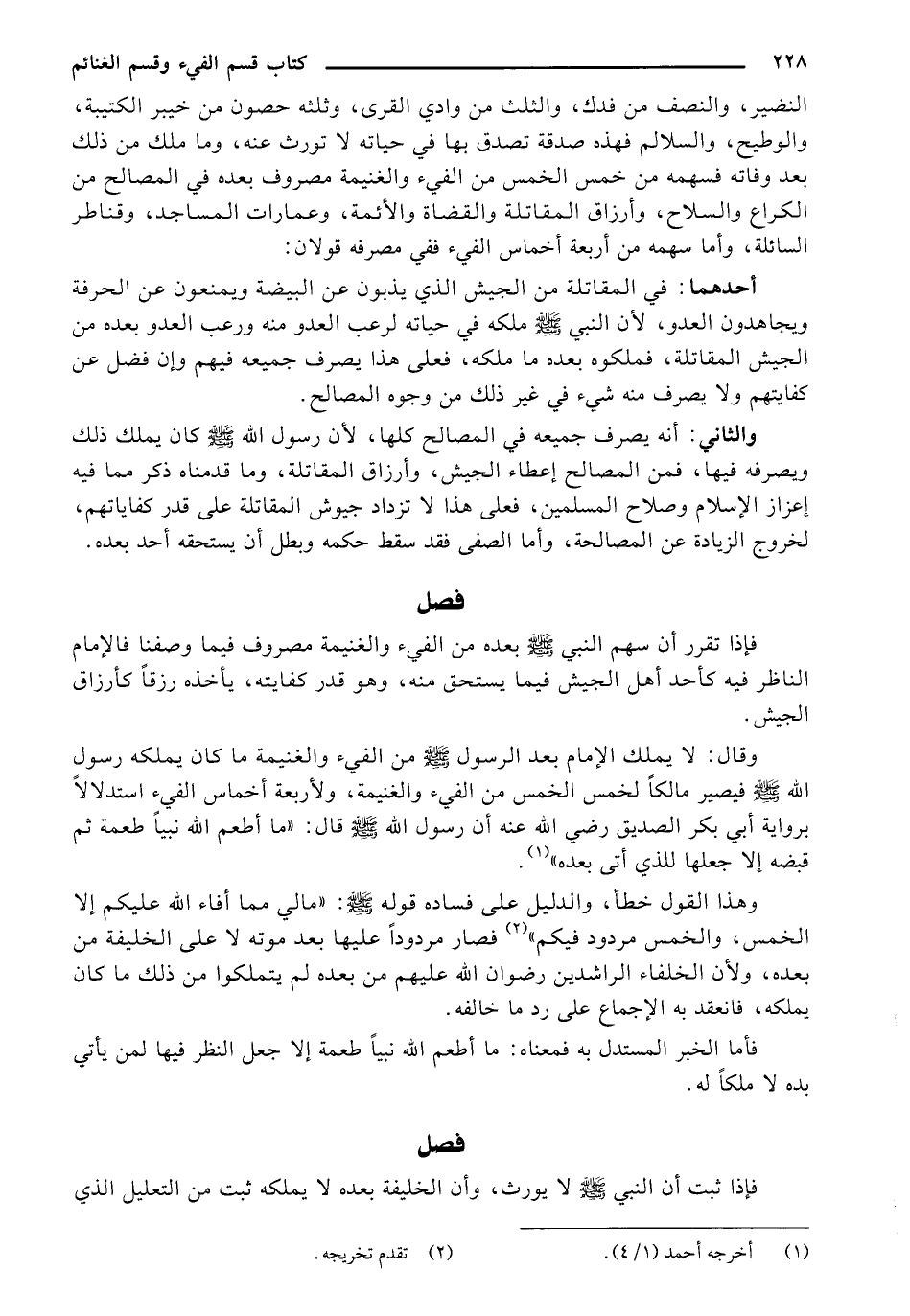 النضير، والنصف من فدك، والثلث من وادي القرى، وثلثه حصون من خيبر الكتيبة، والوطيح، والسلالم فهذه صدقة تصدق بها في حياته لا تورث عنه، وما ملك من ذلك بعد وفاته فسهمه من خمس الخمس من الفيء والغنيمة مصروف بعده في المصالح من الكراع والسلاح، وأرزاق المقاتلة والقضاة والأئمة، وعمارات المساجد، وقناطر السائلة، وأما سهمه من أربعة أخماس الفيء ففي مصرفه قولان: