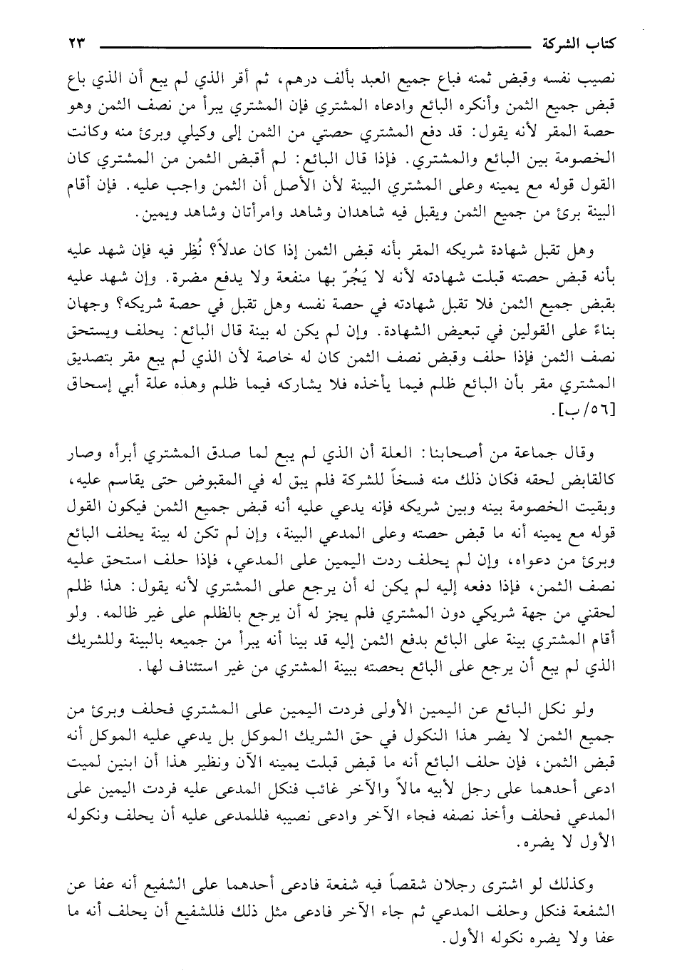 وقال جماعة من أصحابنا: العلة أن الذي لم يبع لما صدق المشتري أبرأه وصار كالقابض لحقه فكان ذلك منه فسخًا للشركة فلم يبق له في المقبوض حتى يقاسم عليه، وبقيت الخصومة بينه وبين شريكه فإن يدعي عليه انه قبض جميع الثمن فيكون القول قوله مع يمينه أنه ما قبض حصته وعلى المدعي البينة، وإن لم تكن له بينه يحلف البائع وبرئ من دعواه، وإن لم يحلف ردت اليمين على المدعي، فإذا حلق استحق عليه نصف الثمن، فإذا دفعه إليه لم يكن له أن يرجع على المشتري لأنه يقول: هذا ظلم لحقني من جهة شريكي دون المشتري فلم يجز له أن يرجع بالظلم على غير ظالمه. ولو أقام المشتري بينة على البائع بدفع الثمن إليه قد بينا أنه يبرأ من جميعه بالبينة وللشريك الذي لم يبع أن يرجع على البائع بحصته بينة المشتري من غير استئناف لها.