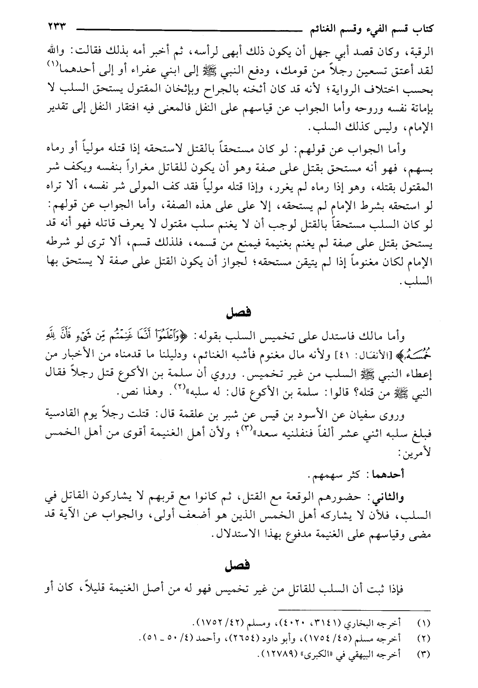 وروى سفيان عن الأسود بن قيس عن شبر بن علقمة قال: قتلت رجلاً يوم القادسية فبلغ سلبه اثني عشر ألفاً فنفلنيه سعد" (¬3)؛ ولأن أهل الغنيمة أقوى من أهل الخمس لأمرين: