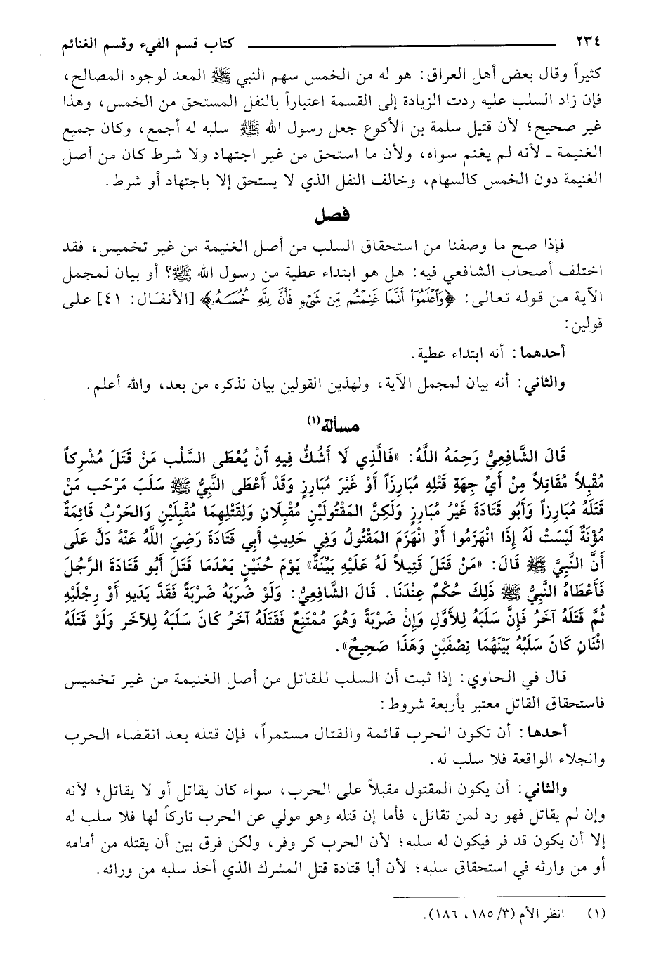 قال الشافعي رحمه الله: "فالذي لا أشك فيه أن يعطى السلب من قتل مشركاً مقبلاً مقاتلا من أي جهة قتله مبارزاً أو غير مبارز وقد أعطى النبي - صلى الله عليه وسلم - سلب مرحب من قتله مبارزاً وأبو قتادة غير مبارز ولكن المقتولين مقبلان ولقتلهما مقبلين والحرب قائمة مؤنه ليست له إذا انهزموا أو انهزم المقتول وفي حديث أبي قتادة - رضي الله عنه - دل على أن النبي - صلى الله عليه وسلم - قال: "من قتل قتيلا له عليه بينه" يوم حنين بعدما قتل أبو قتادة الرجل فأعطاه النبي - صلى الله عليه وسلم - ذلك حكم عندنا. قال الشافعي: ولو ضربه ضربة فقد يديه أو رجليه ثم قتله آخر فمان سلبه للأول وإن ضربة وهو ممتنع فقتله آخر كان سلباً للآخر ولو قتله اثنان كان سلبه بينهما نصفين وهذا صحيح".