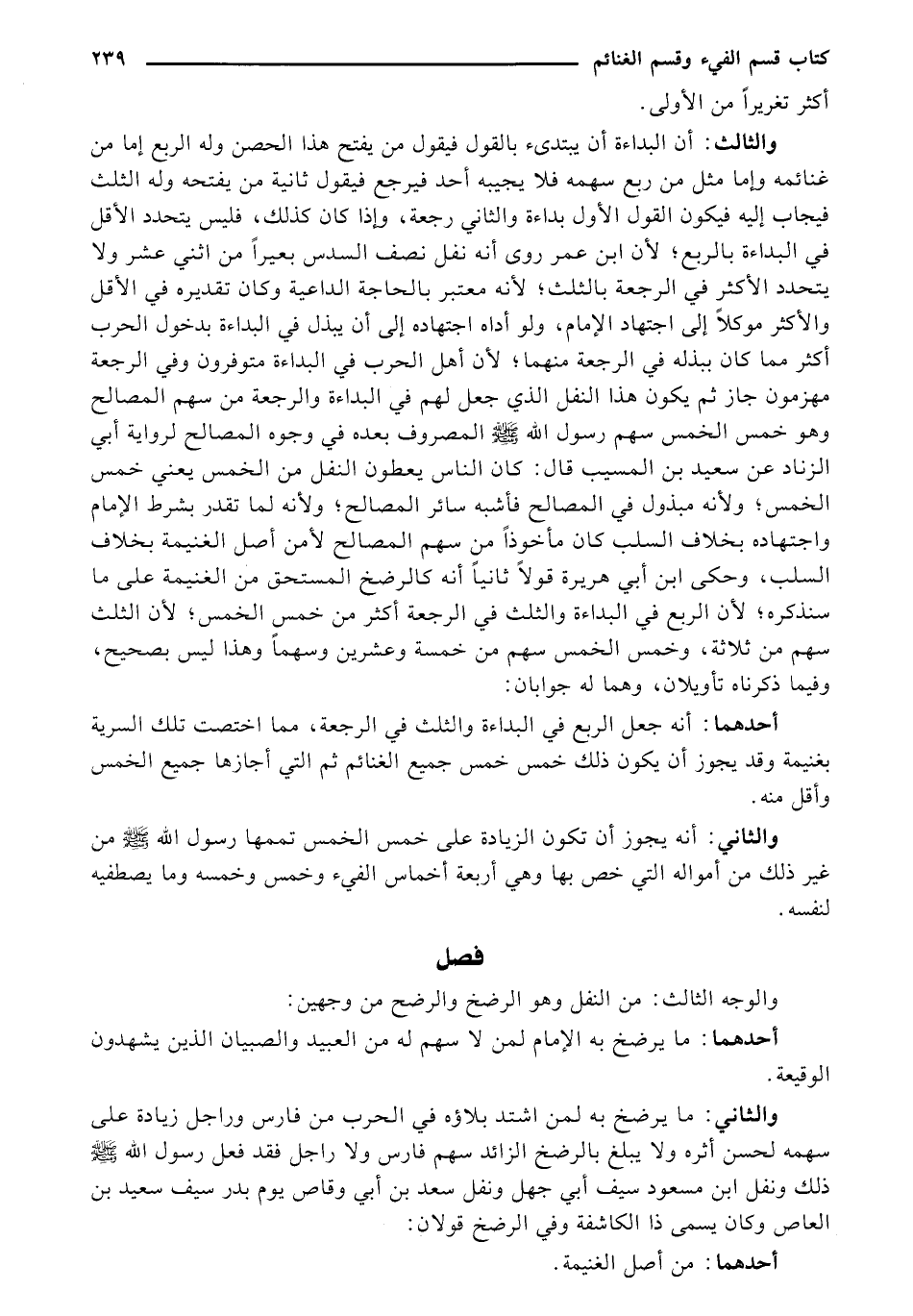 والثالث: أن البداءة أن يبتدئ بالقول فيقول من يفتح هذا الحصن وله الربع إما من غنائمه وإما مثل من ربع سهمه فلا يجيبه أحد فيرجع فيقول ثانية من يفتحه وله الثلث فيجاب إليه فيكون القول الأول بداءة والثاني رجعة، وإذا كان كذلك، فليس يتحدد الأقل في البداءة بالربع: لأن ابن عمر روى أنه نفل نصف السدس بعيراً من اثني عشر ولا يتحدد الأكثر في الرجعة بالثلث؛ لأنه معتبر بالحاجة الداعية وكان تقديره في الأقل والأكثر موكلاُ إلى اجتهاد الإمامء ولو أداه اجتهاده إلى أن يبذل في البداءة بدخول الحرب أكثر مما كان ببذله في الرجعة منهما؛ لأن أهل الحرب في البداءة متوفرون وفي الرجعة مهزمون جاز ثم يكون هذا النفل الذي جعل لهم في البداءة والرجعة من سهم المصالح وهو خمس الخمس سهم رسول الله - صلى الله عليه وسلم - المصروف بعده في وجوه المصالح لرواية أبي الزناد عن سعيد بن المسيب قال: كان الناس يعطون النفل من الخمس يعني خمس الخمس؛ ولأنه مبذول في المصالح فأشبه سائر المصالح؛ ولأنه لما تقدر بشرط الإمام واجتهاده بخلاف السلب كان مأخوذاً من سهم المصالح لأمن أصل الغنيمة بخلاف السلب، وحكى ابن أبي هريرة قولاً ثانياً أنه كالرضخ المستحق من الغنيمة على ما سنذكره: لأن الربع في البدا، ة والثلث في الرجعة أكثر من خمس الخمس: لأن الثلث سهم من ثلاثة، وخمس الخمس سهم من خمسة وعشرين وسهماً وهذا ليس بصحيح، وفيما ذكرناه تأويلان، وهما له جوابان: