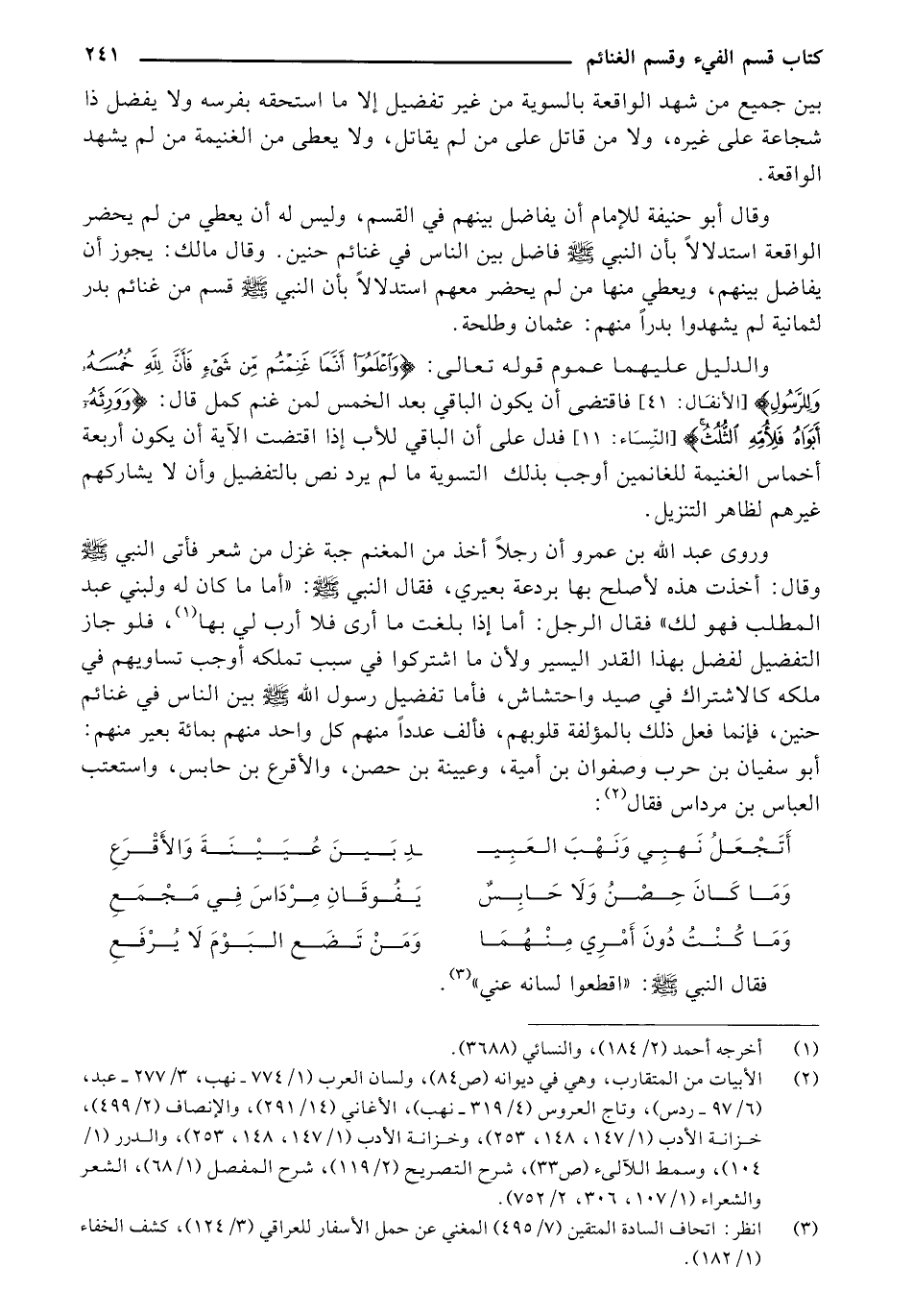 وروى عبد الله بن عمرو أن رجلاً أخذ من المغنم جبة غزل من شعر فأتى النبي - صلى الله عليه وسلم - وقال: أخذت هذه لأصلح بها بردعة بعيري، فقال النبي - صلى الله عليه وسلم -: "أما ما كان له ولبني عبد المطلب فهو لك" فقال الرجل: أما إذا بلغت ما أرى فلا أرب لي بها (¬1)، فلو جاز التفضيل لفضل بهذا القدر اليسير ولأن ما اشتركوا في سبب تملكه أوجب تساويهم في ملكه كالاشتراك في صيد واحتشاش، فأما تفضيل رسول الله - صلى الله عليه وسلم - بين الناس في غنائم حنين، فإنما فعل ذلك بالمؤلفة قلوبهم، فألف عدداً منهم كل واحد منهم بمائة بعير منهم: أبو سفيان بن حرب وصفوان بن أمية، وعيينة بن حصن، والأقرع بن حابس، واستعتب العباس بن مرداس فقال (¬2):