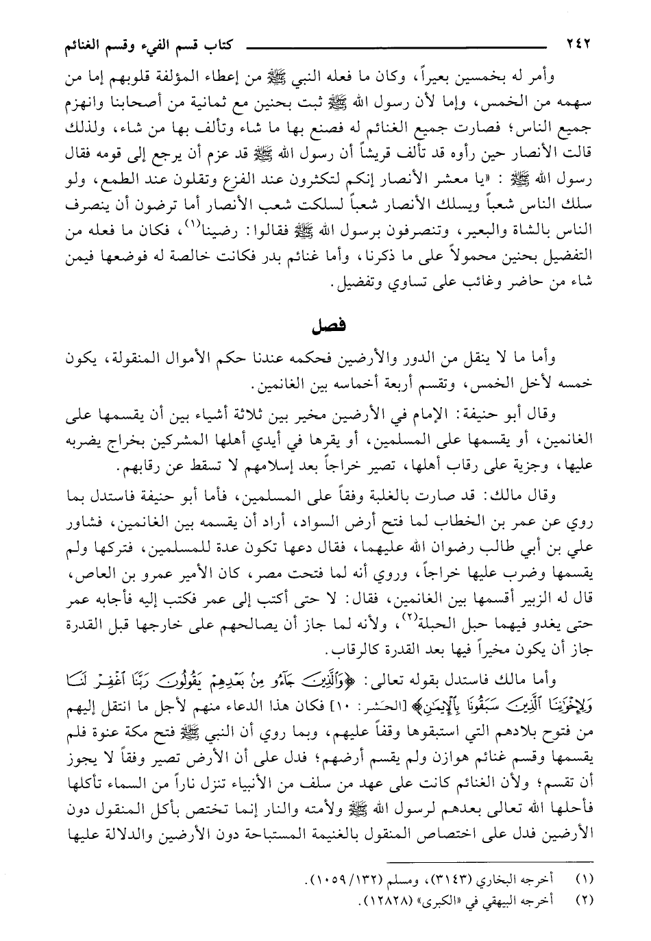 وأمر له بخمسين بعيراً، وكان ما فعله النبي - صلى الله عليه وسلم - من إعطاء المؤلفة قلوبهم إما من سهمه من الخمس، وإما لأن رسول الله - صلى الله عليه وسلم - ثبت بحنين مع ثمانية من أصحابنا وانهزم جميع الناس؛ فصارت جميع الغنائم له فصنع بها ما شاء وتألف بها من شاء، ولذلك قالت الأنصار حين رأوه قد تألف قريشاً أن رسول الله - صلى الله عليه وسلم - قد عزم أن يرجع إلى قومه فقال رسول الله - صلى الله عليه وسلم -: "يا معشر الأنصار إنكم لتكثرون عند الفزع وتقلون عند الطمع، ولو سلك الناس شعباً ويسلك الأنصار شعباً لسلكت شعب الأنصار أما ترضون أن ينصرف الناس بالشاة والبعير، وتنصرفون برسول الله - صلى الله عليه وسلم - فقالوا: رضينا (¬1)، فكان ما فعله من التفضيل بحنين محمولاً على ما ذكرنا، وأما غنائم بدر فكانت خالصة له فوضعها فيمن شاء من حاضر وغائب على تساوي وتفضيل.